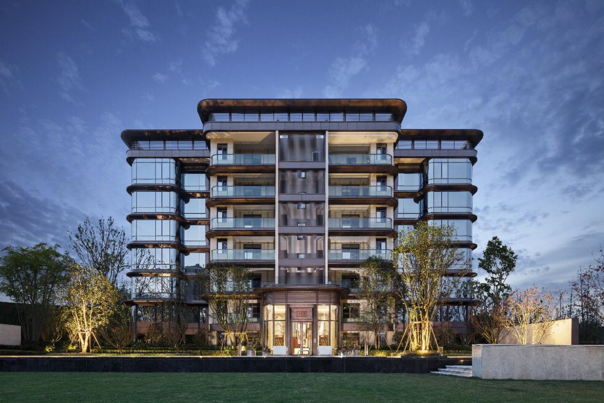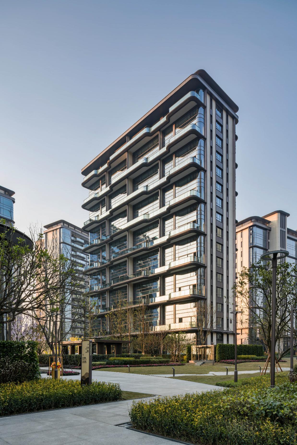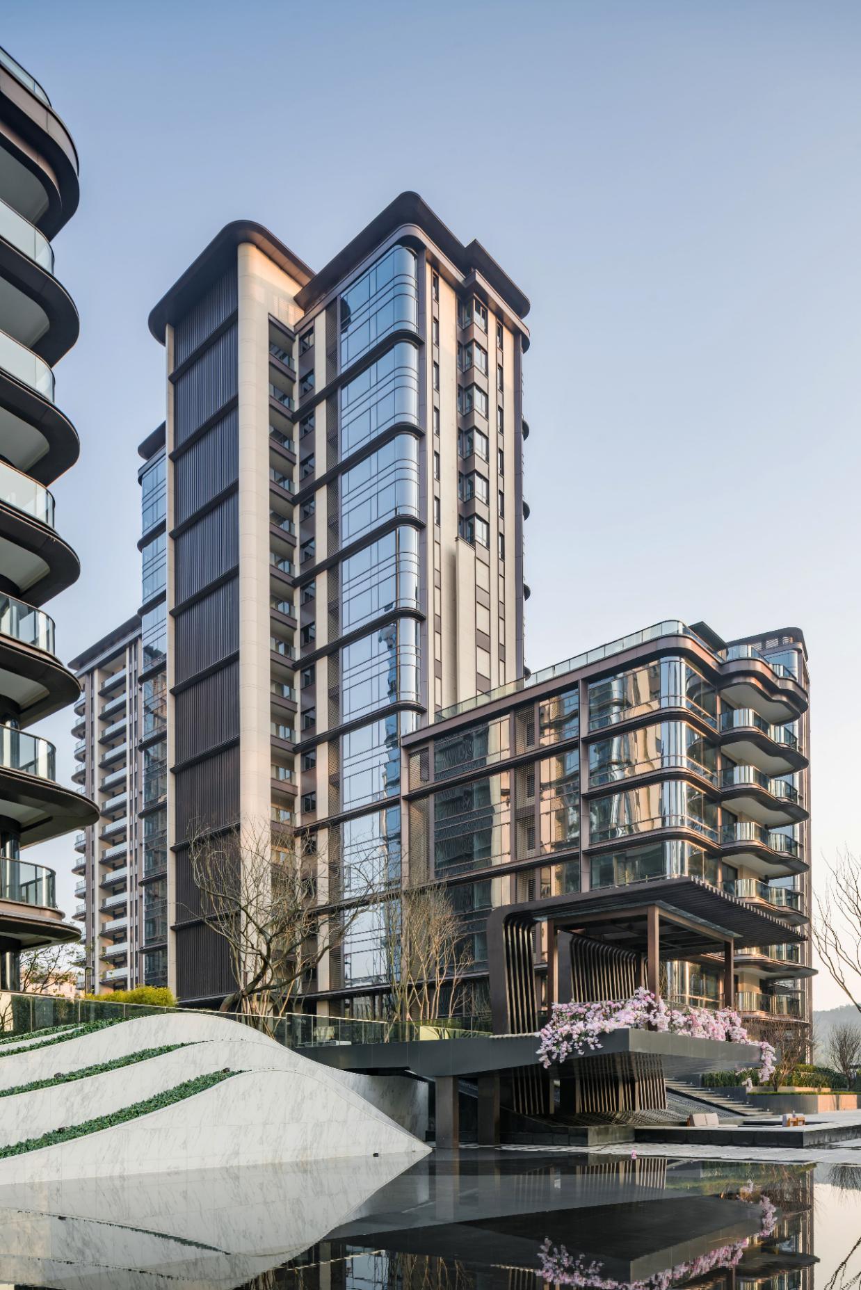 外立面設(shè)計(jì)上引用藏山納水的設(shè)計(jì)理念,形態(tài)上舍棄了傳統(tǒng)住宅的剛正形象,采用弧形立面設(shè)計(jì),將山的剛毅,與水的柔和完美演繹,宛如生長在照母山上的植物一般,充滿生命力。