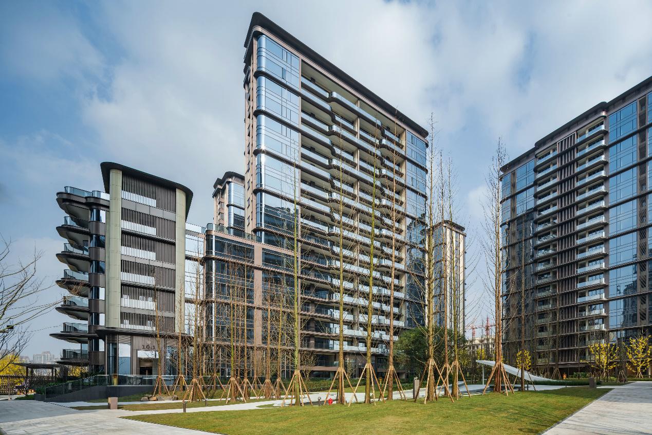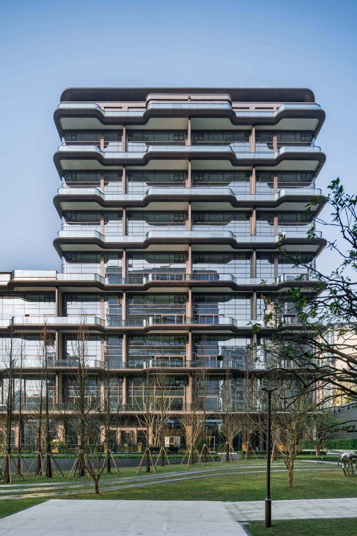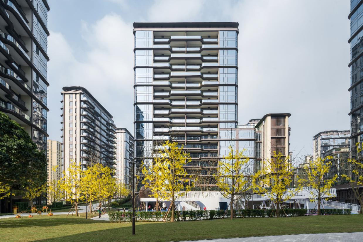 外立面設(shè)計(jì)上引用藏山納水的設(shè)計(jì)理念,形態(tài)上舍棄了傳統(tǒng)住宅的剛正形象,采用弧形立面設(shè)計(jì),將山的剛毅,與水的柔和完美演繹,宛如生長在照母山上的植物一般,充滿生命力。