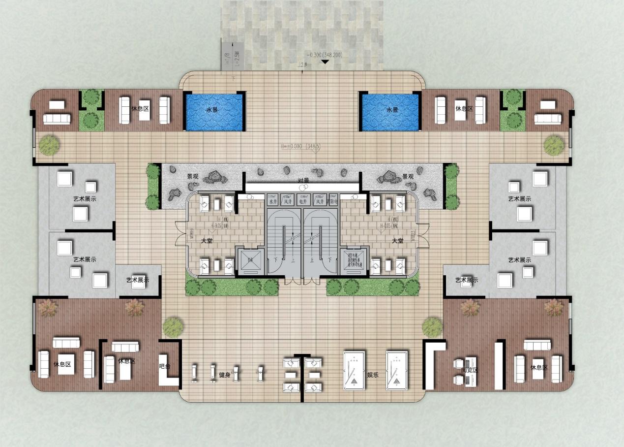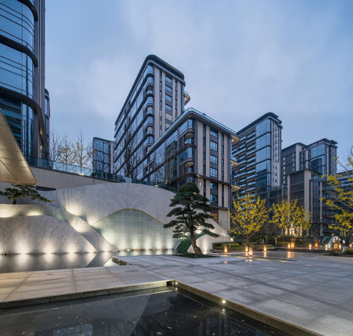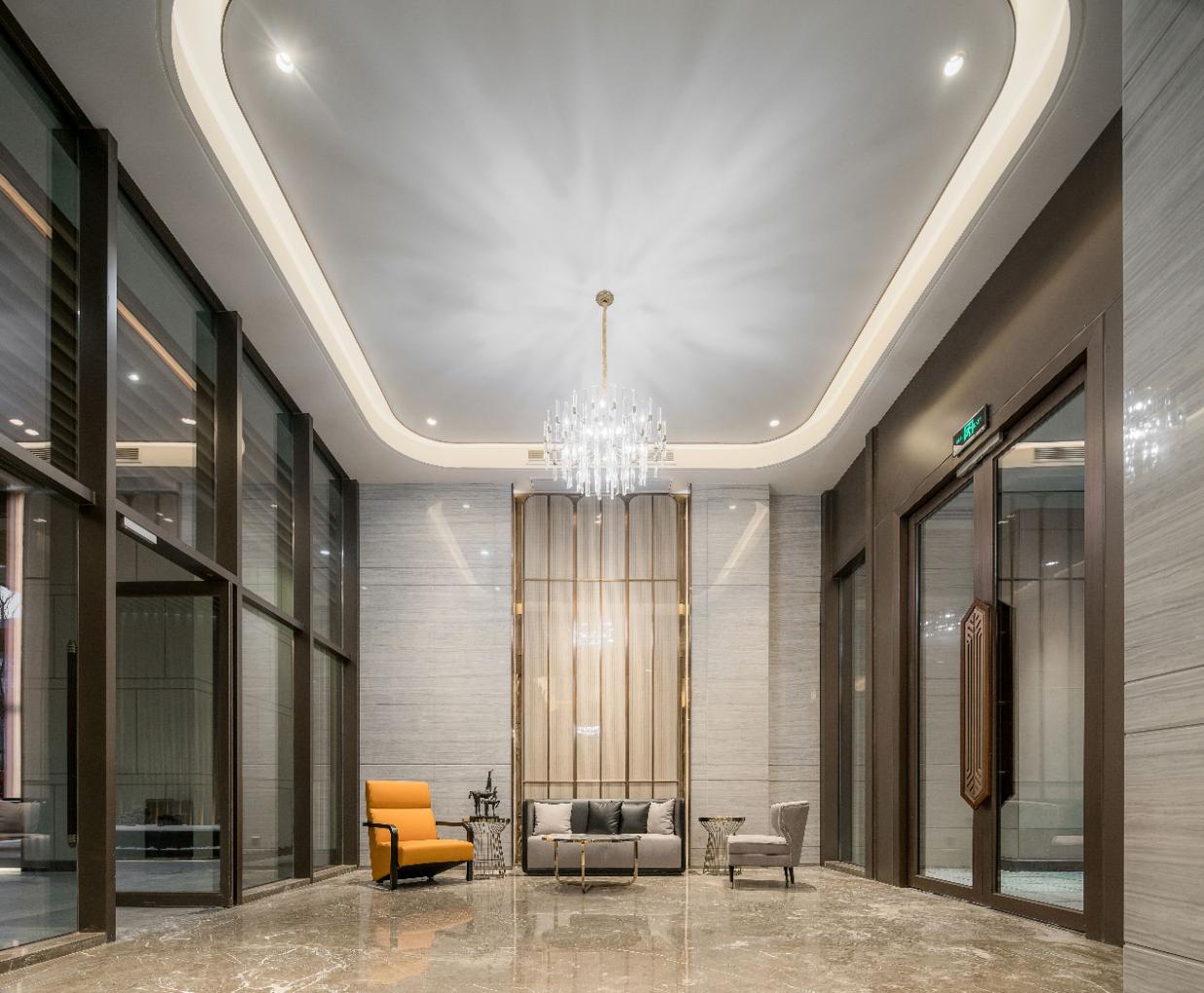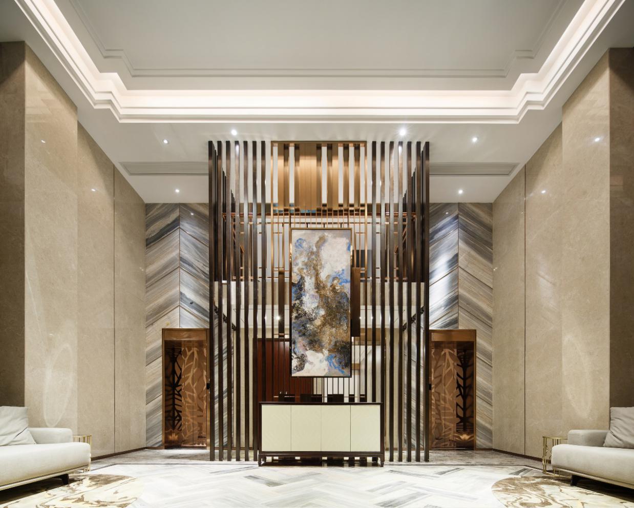 在入戶大堂設(shè)計(jì)中,用精工打造出有“溫度”的建筑空間,6米挑高來營造入戶大堂的舒適感,即便是從山水里進(jìn)入室內(nèi),也怡然自得。地面和墻面都是拼花的石材鋪就,不會(huì)因室內(nèi)而失了尺度。