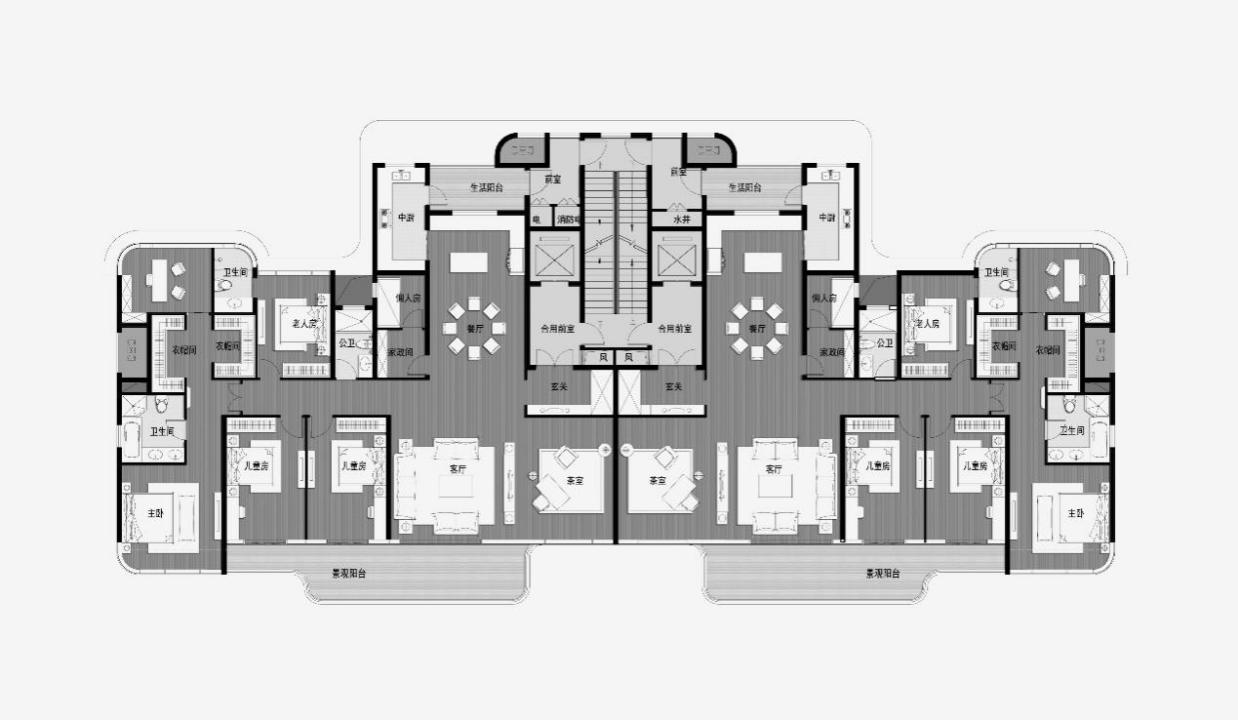 “當(dāng)人類用感情和希望去創(chuàng)造一樣?xùn)|西,那一樣?xùn)|西就會(huì)被賦予靈魂。” 設(shè)計(jì)師對(duì)于居住人群生活方式的研究,利用空間設(shè)計(jì)不僅使家庭活動(dòng)緊密團(tuán)結(jié),又給予各自私密空間。起居室的比例安排、對(duì)空間的正式與非正式程度的感知及入口空間的位置都是設(shè)計(jì)師在理解人類的生理和心理行為后所確定的。9米橫廳,2米陽臺(tái),弧形轉(zhuǎn)角窗都為居住者提供最佳景觀條件。