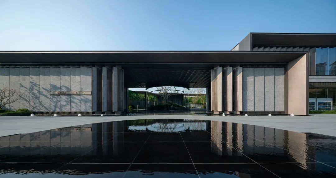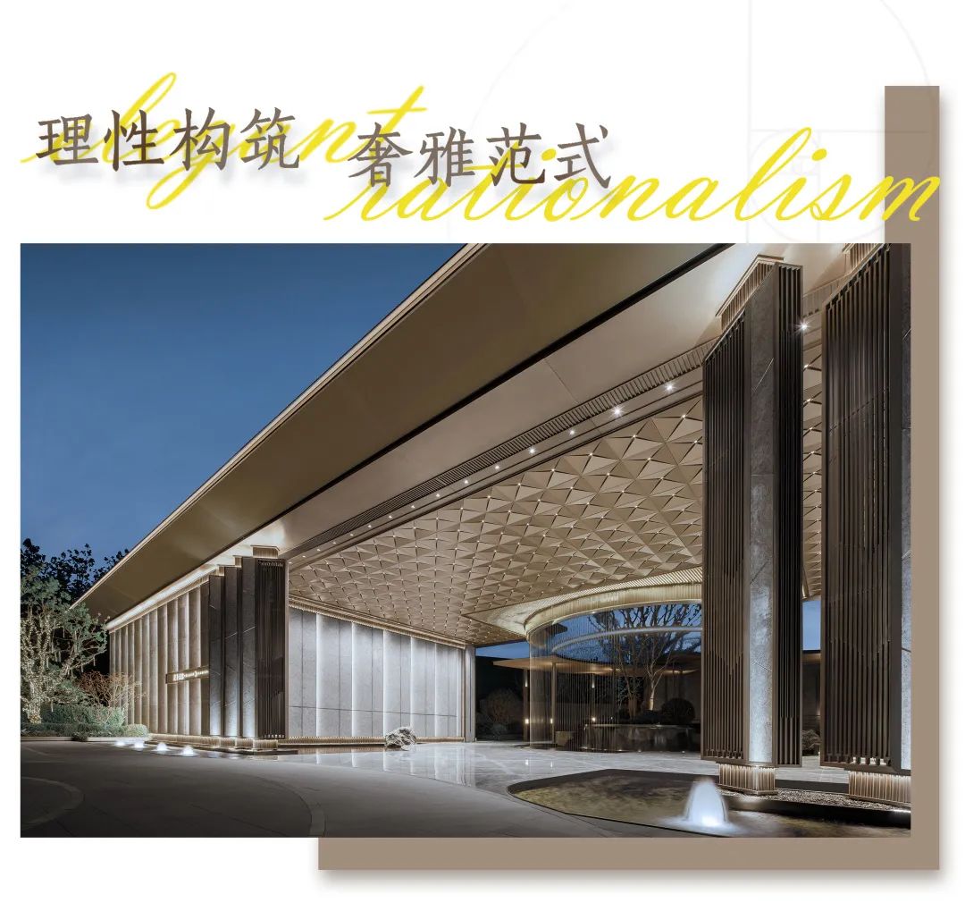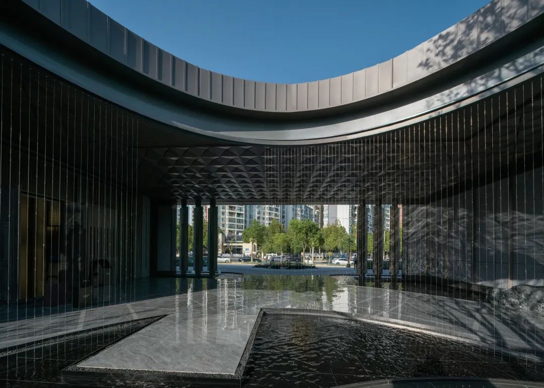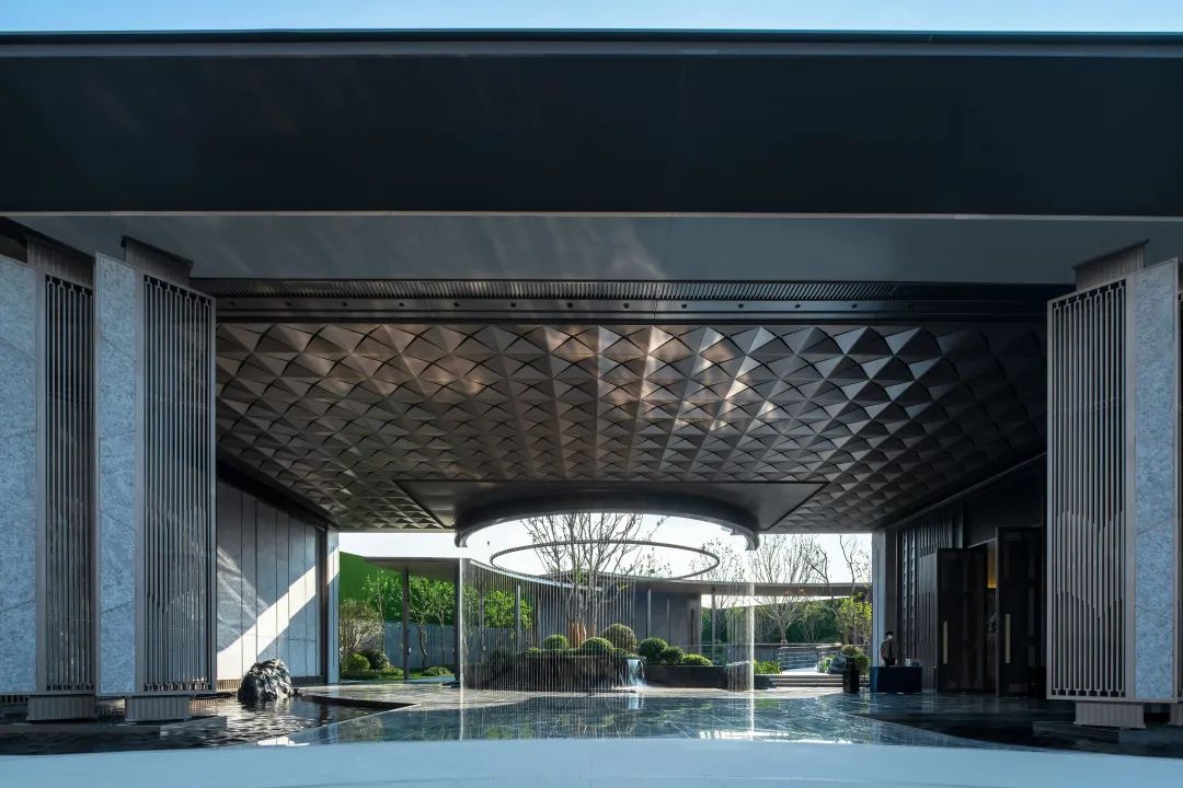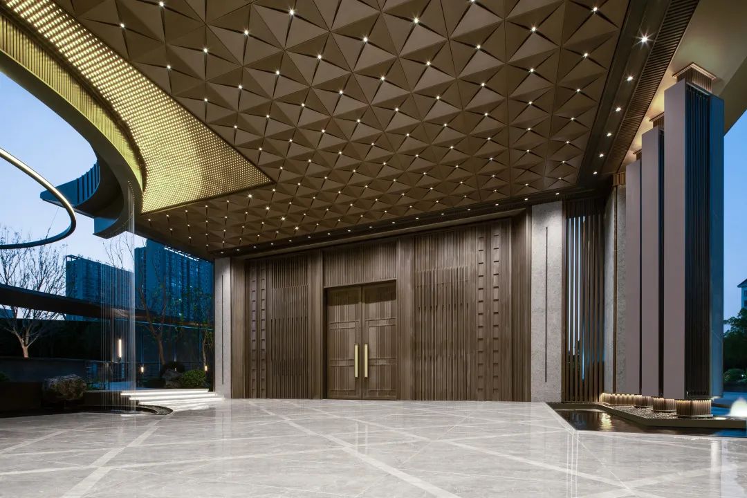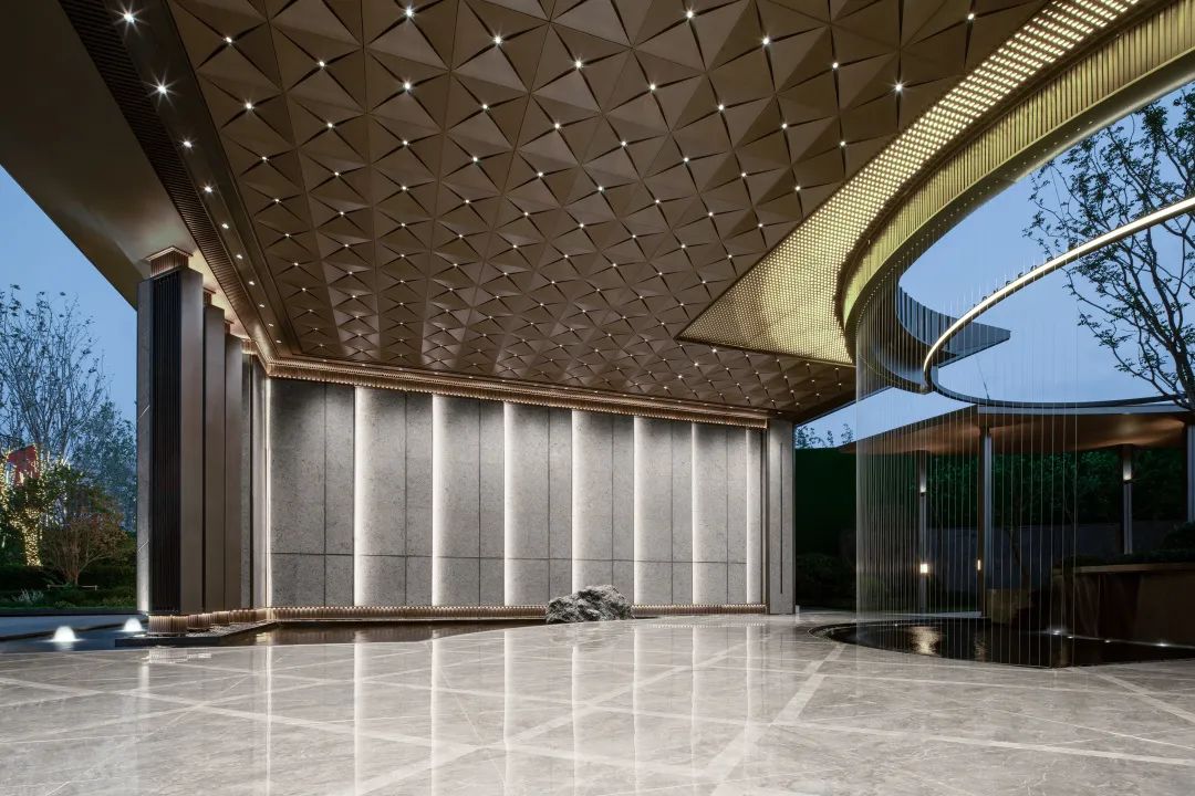 攬境傾向于現(xiàn)代化的藝術(shù)表達(dá)方式,約38m酒店式星空門頭和巨型迎賓水瀑締造高端奢雅的酒店式氛圍,依照黃金分割弧線切入的天空消解了暗色、材質(zhì)與體量帶來的壓迫感。