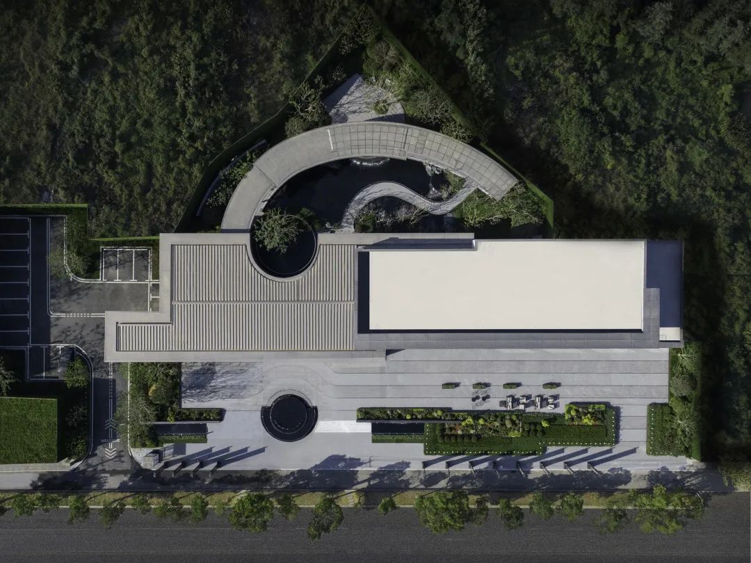 入口隔開了城市的喧囂,開敞式的設(shè)計如同畫框,步入后亦可回望繁華之色。沿著黃金比例柔和的弧線景觀連廊和水上浮橋從自然中生長,圈一域水景,籠一方寧靜。