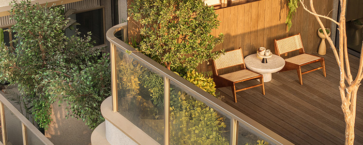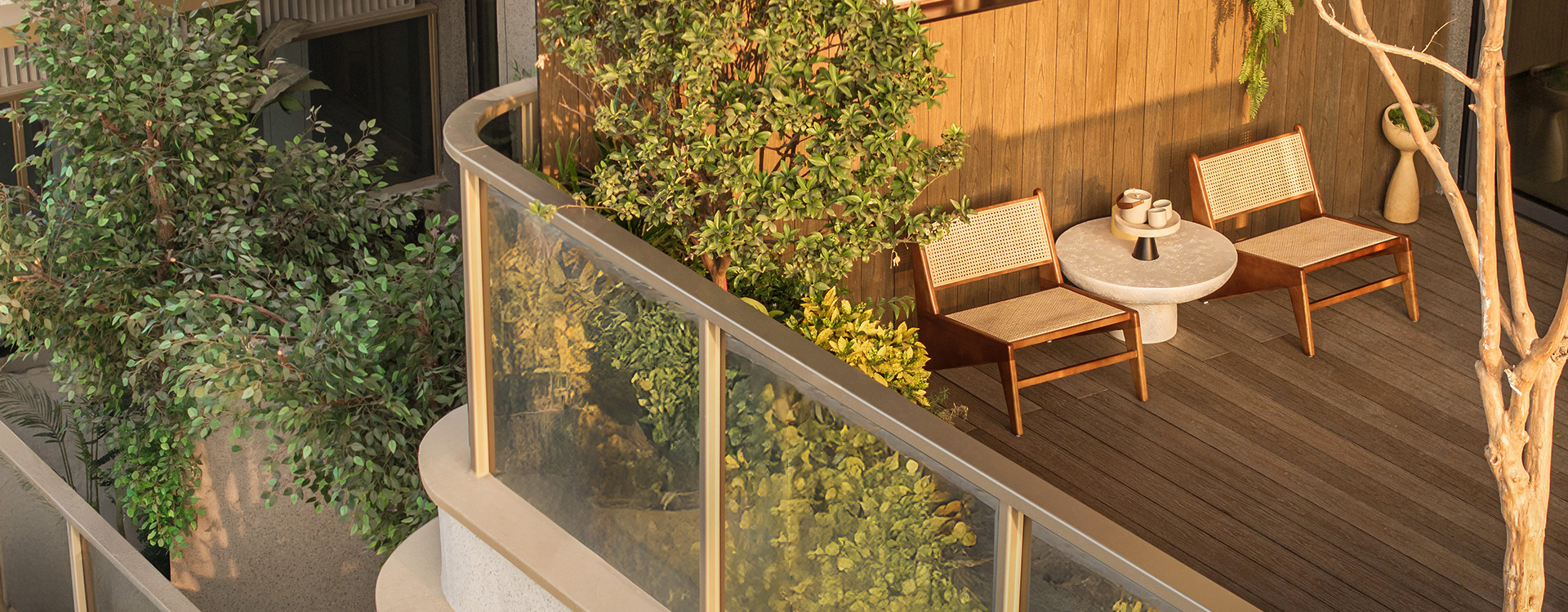 通過設(shè)置定向格柵及磨砂玻璃規(guī)避相鄰花園間的視線干擾