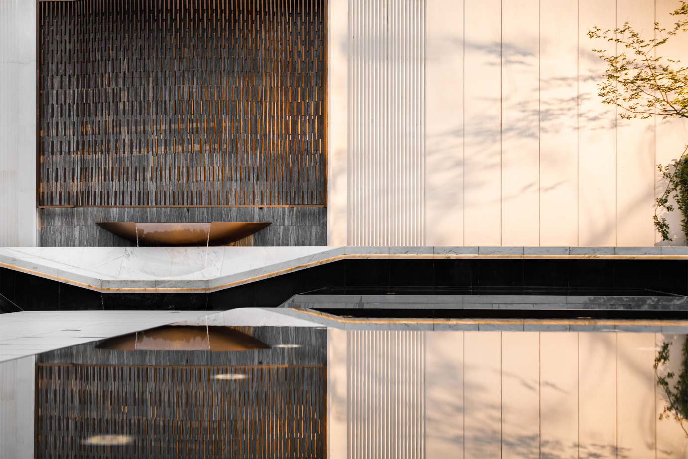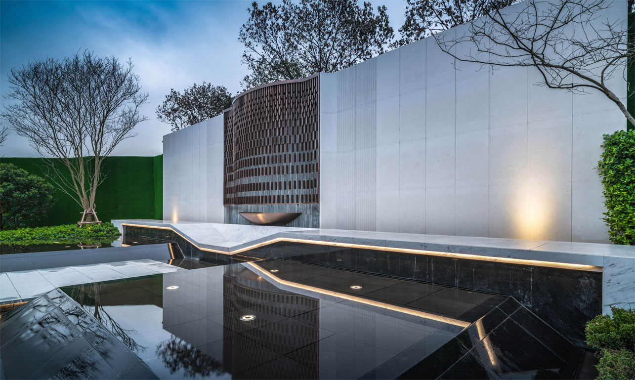 古時,有門,必有壁。中式建筑特有的部分,具有藏風(fēng)納氣的吉祥寓意,增加了門前廣場的內(nèi)聚力,造成對景效果。將高山流水的意境置入園區(qū)景墻內(nèi),晝與夜的交替,時間洪流的穿梭。賦予景觀內(nèi)涵文化,詮釋古典韻味,收納東方禮序于歸家伊始,呈現(xiàn)傳統(tǒng)風(fēng)雅。
