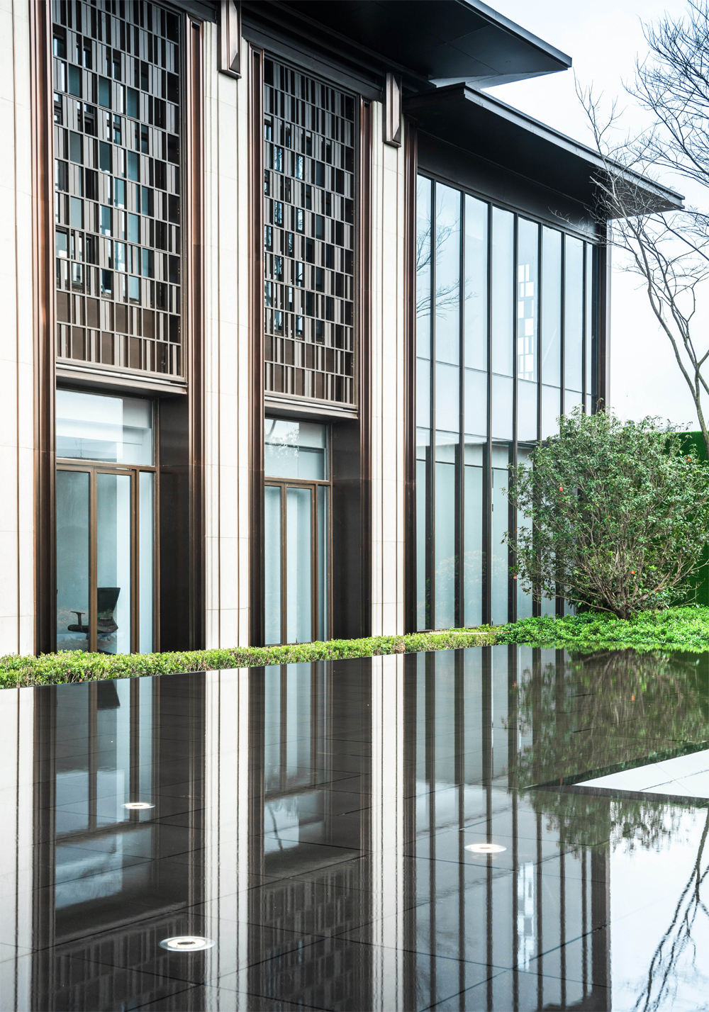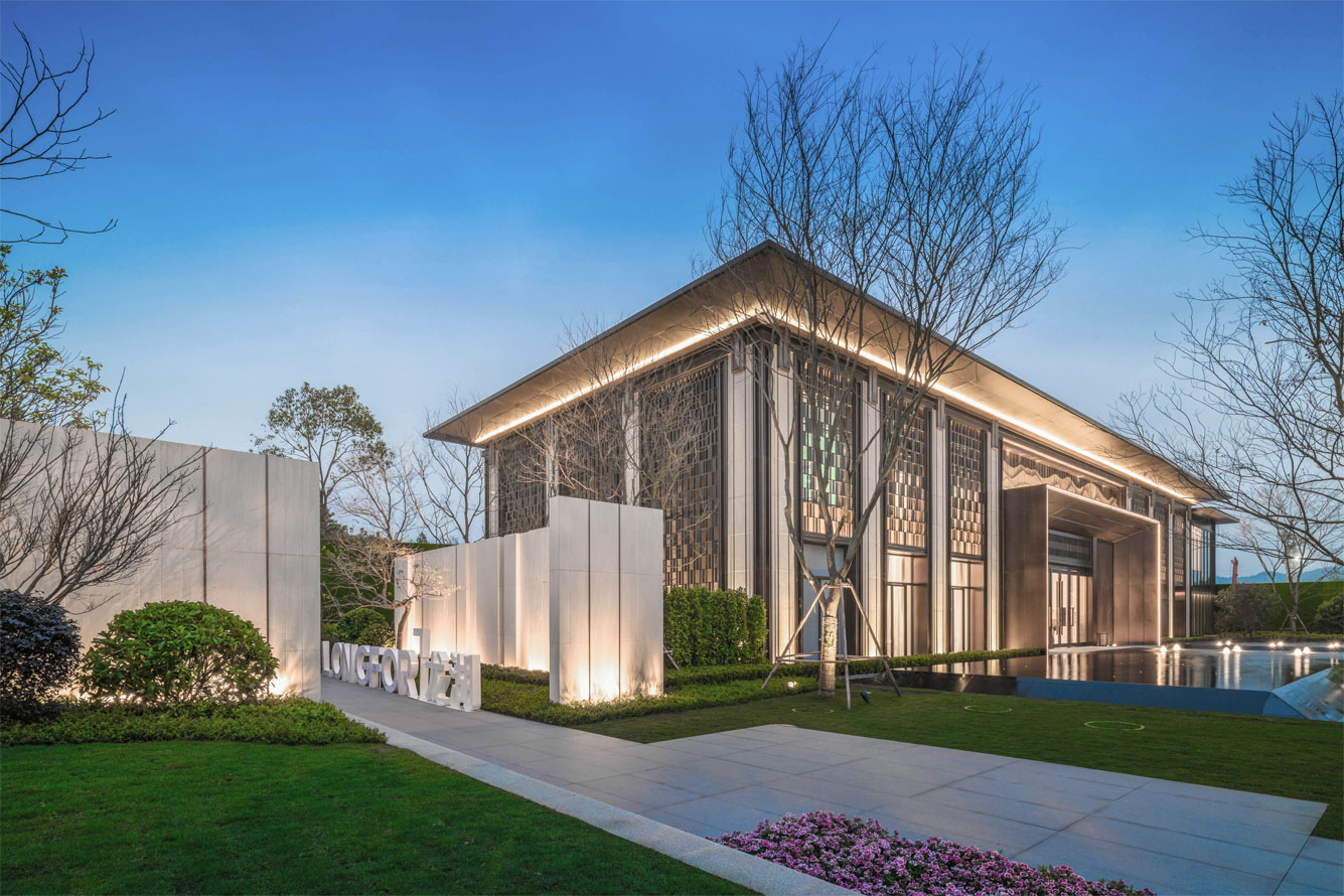 建筑形制提取古建筑的中軸對稱開間的元素,遞進有序。以銅制裝飾柱形成纖細(xì)的柱廊序列,賦予生活莊嚴(yán)大美的儀式感,禮賢有序的禮制之美。不僅一梁一柱都要進行藝術(shù)加工,著力于建筑細(xì)部的刻畫,并且對于裝飾更是細(xì)致處理。