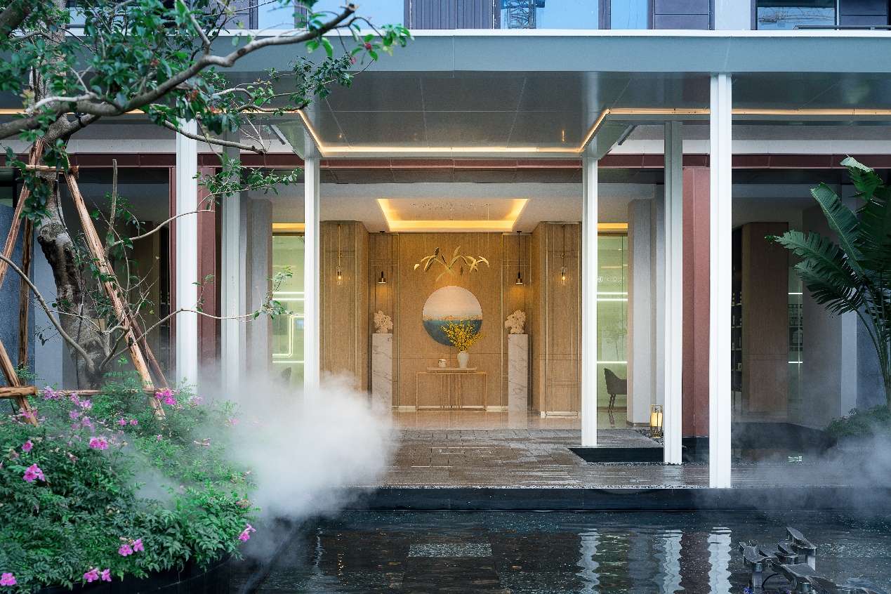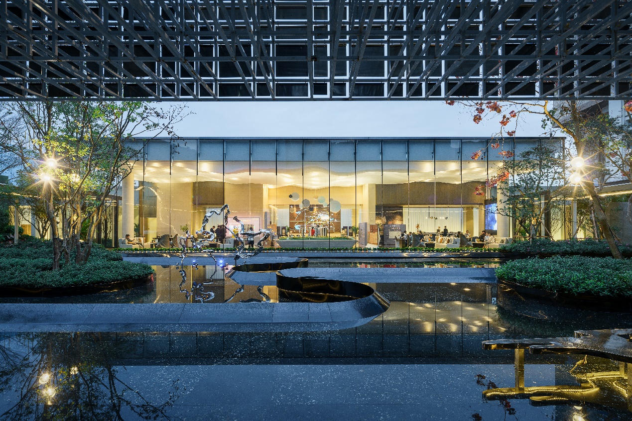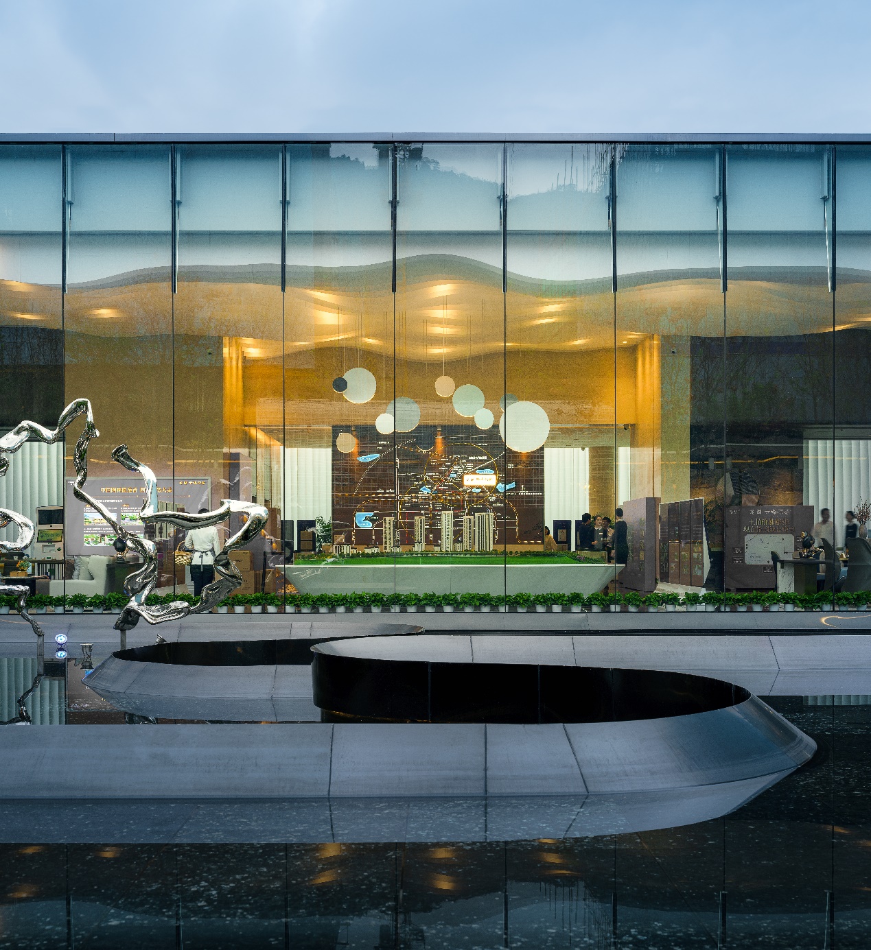 庭院是將建筑、山水、花木等元素通過藝術(shù)手法組合而成的建筑綜合體。“向心而筑”這種建筑空間形成了獨特的文化魅力,用來營造單體與群體空間。內(nèi)向性空間布局由其功能決定,在整個項目交通最便利,最佳昭示面的位置布置了展示中心,不僅僅達到了形象與功能的平衡,也達到了效率與體驗的完美結(jié)合。