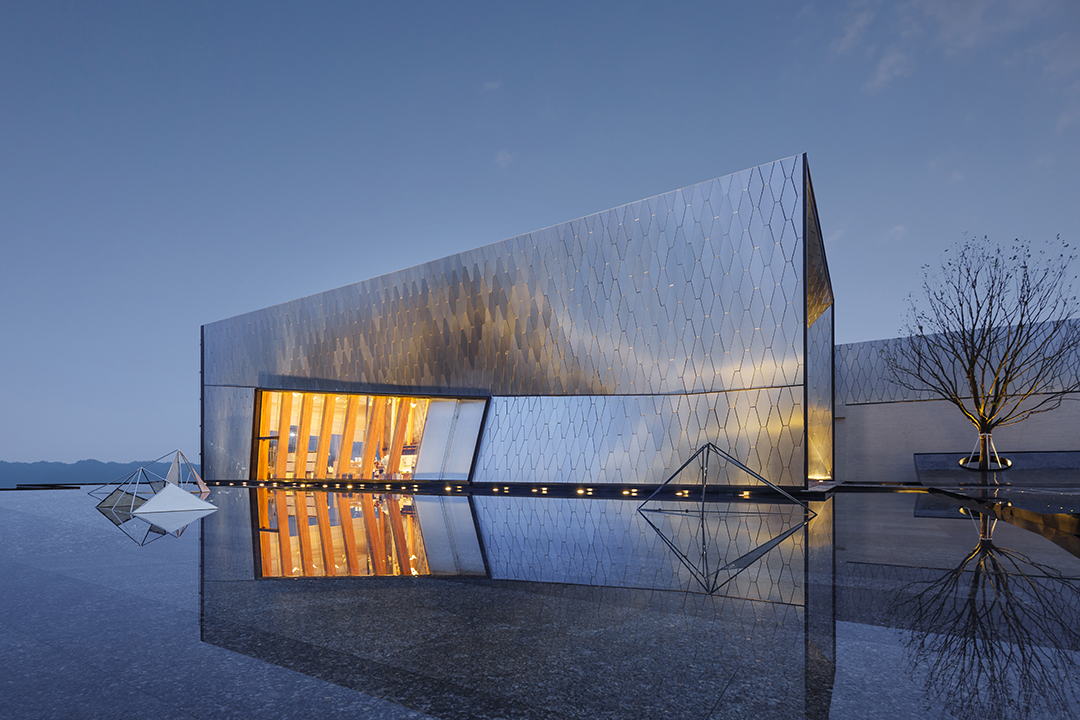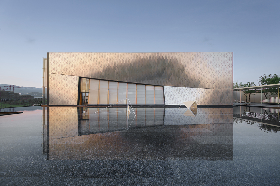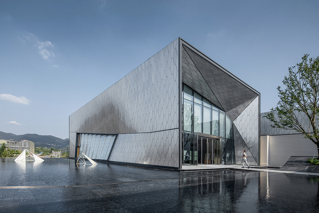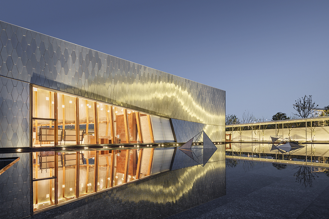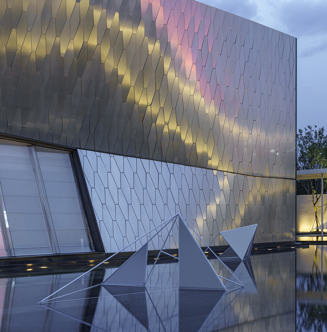 建筑師以六邊形鋁板作為主要界面材料,覆蓋于內(nèi)部結(jié)構(gòu)之上。表皮順應(yīng)真實的建筑形態(tài)變化,每塊蜂窩鋁板精細(xì)包邊,開縫拼掛,細(xì)節(jié)考究。數(shù)字化的表現(xiàn)手法營造出“Cyberpunk”(賽博朋克)的超時空現(xiàn)代感,表皮在自然光下形塑特質(zhì),追隨光線的變化,產(chǎn)生復(fù)雜而神秘的視覺效果。
