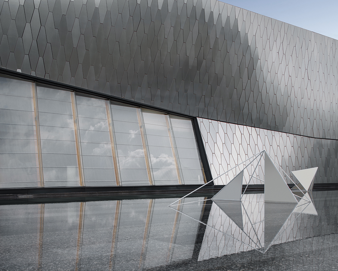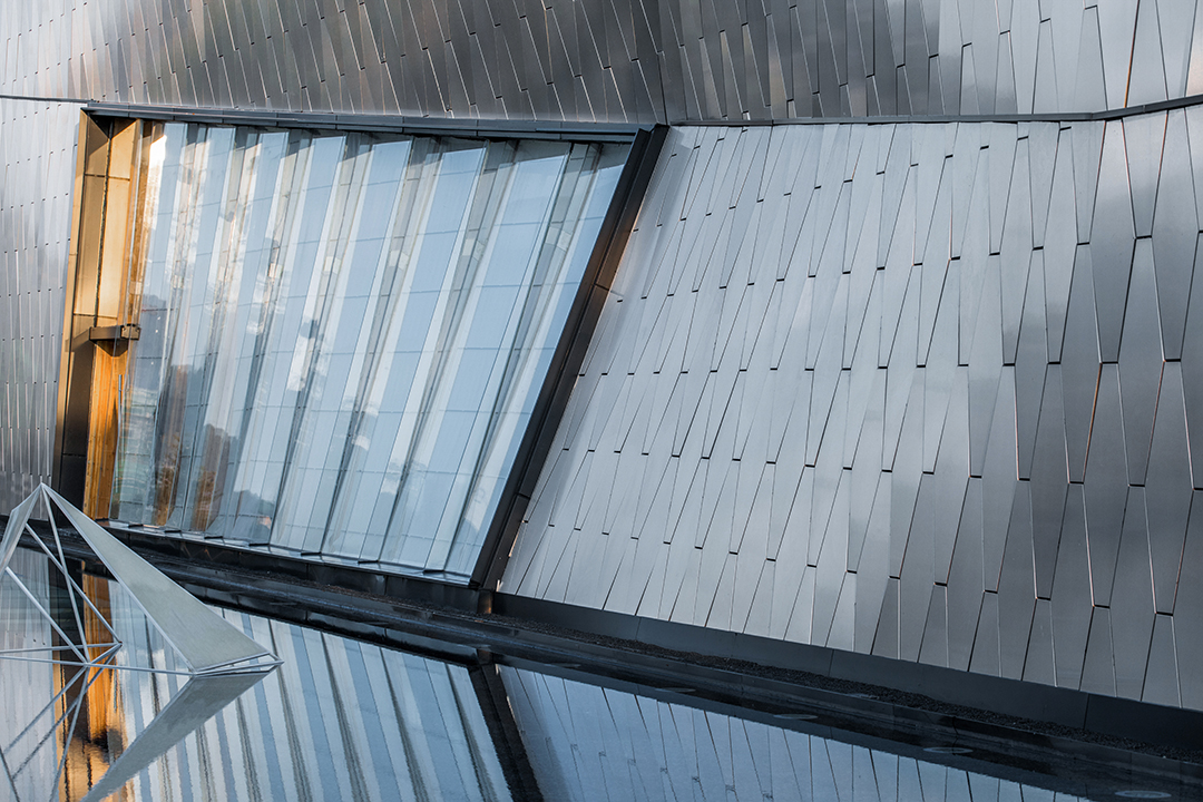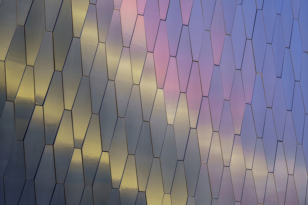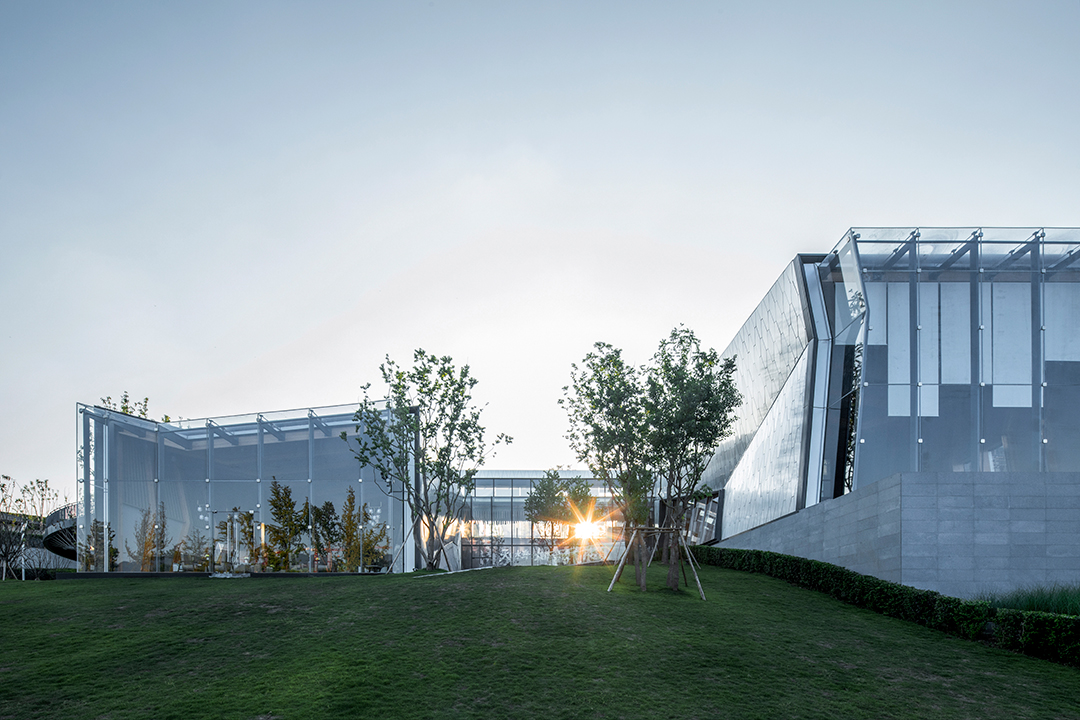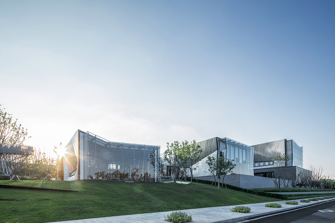 建筑師以六邊形鋁板作為主要界面材料,覆蓋于內(nèi)部結(jié)構(gòu)之上。表皮順應(yīng)真實的建筑形態(tài)變化,每塊蜂窩鋁板精細(xì)包邊,開縫拼掛,細(xì)節(jié)考究。數(shù)字化的表現(xiàn)手法營造出“Cyberpunk”(賽博朋克)的超時空現(xiàn)代感,表皮在自然光下形塑特質(zhì),追隨光線的變化,產(chǎn)生復(fù)雜而神秘的視覺效果。