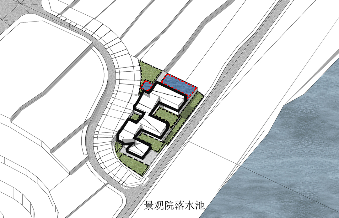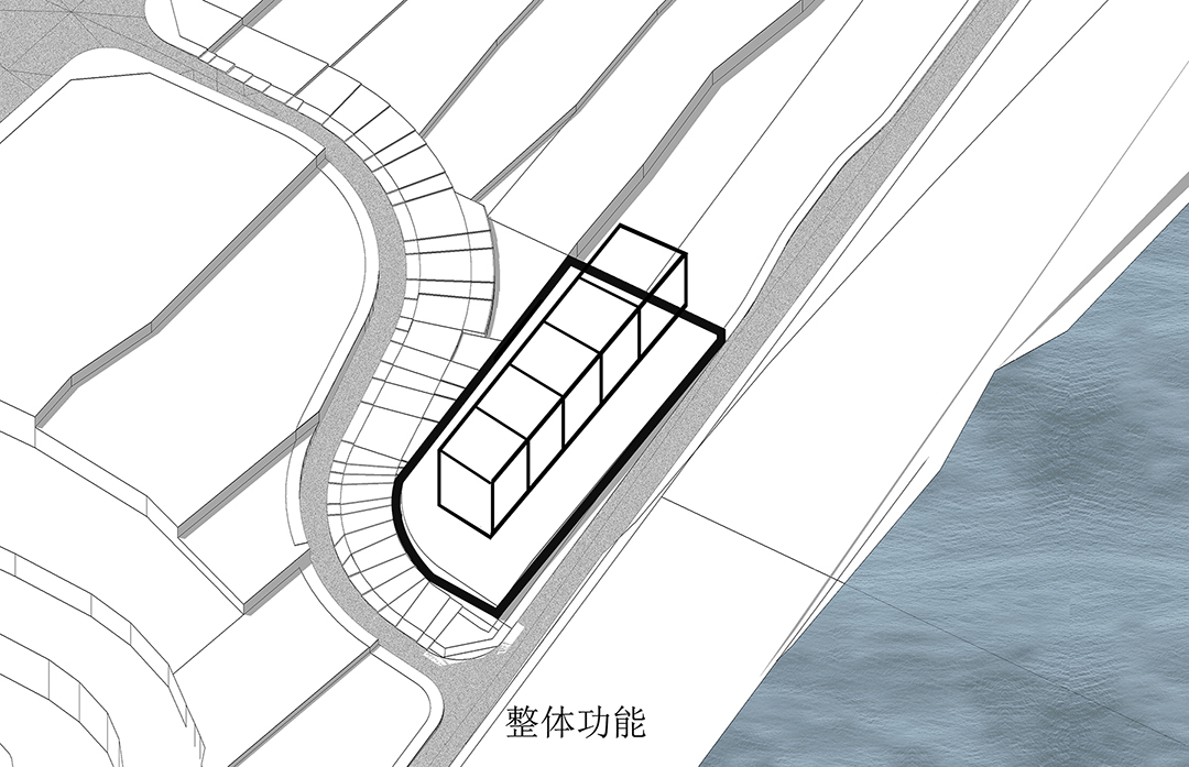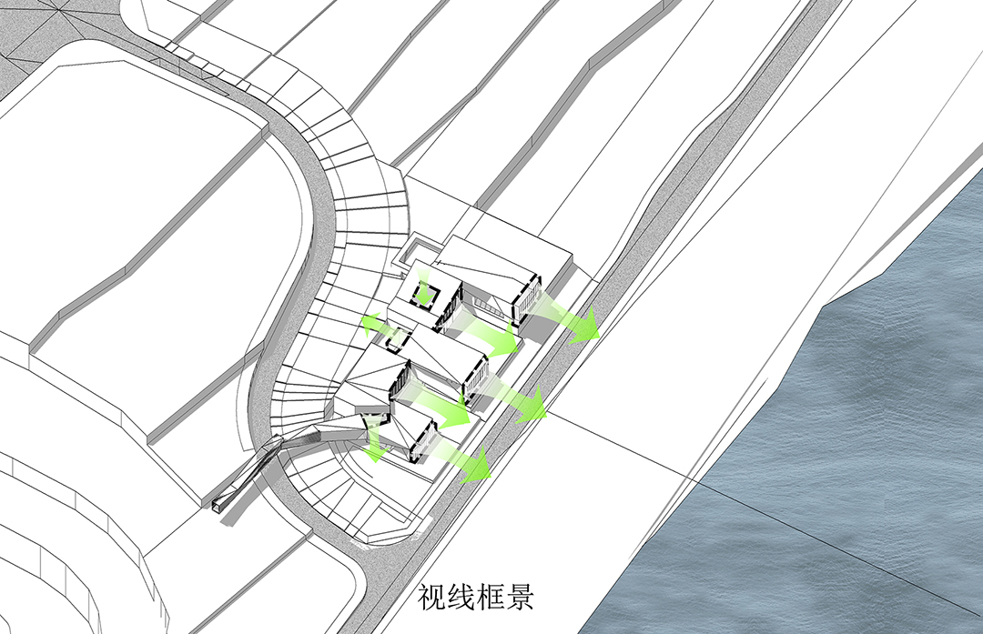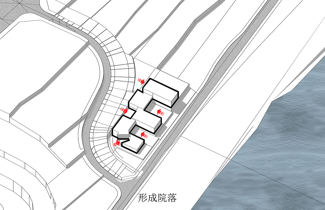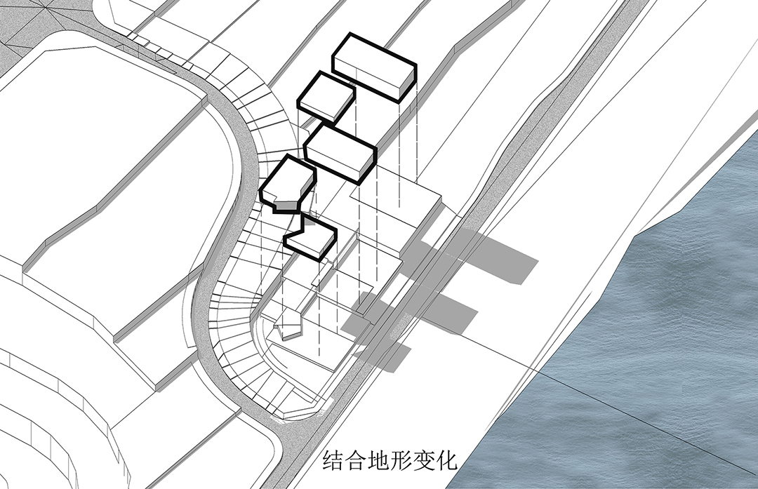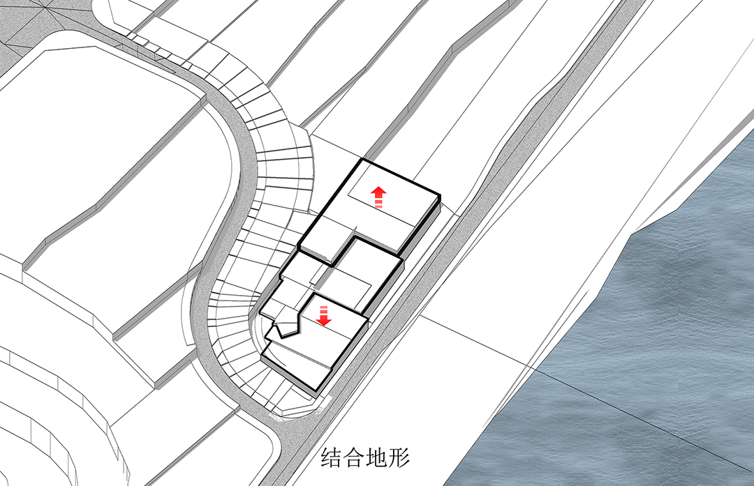 作為對環(huán)境的回應(yīng),建筑師將三個體量不同的盒子并列于山坡上,垂直于濱河道路,以期達(dá)到濱河景觀及遠(yuǎn)山的最佳觀賞。通過建筑與環(huán)境的互塑共生,使遠(yuǎn)山、河流、庭院、建筑重塑構(gòu)成新的秩序,營造獨有坡地特征的建筑群落。