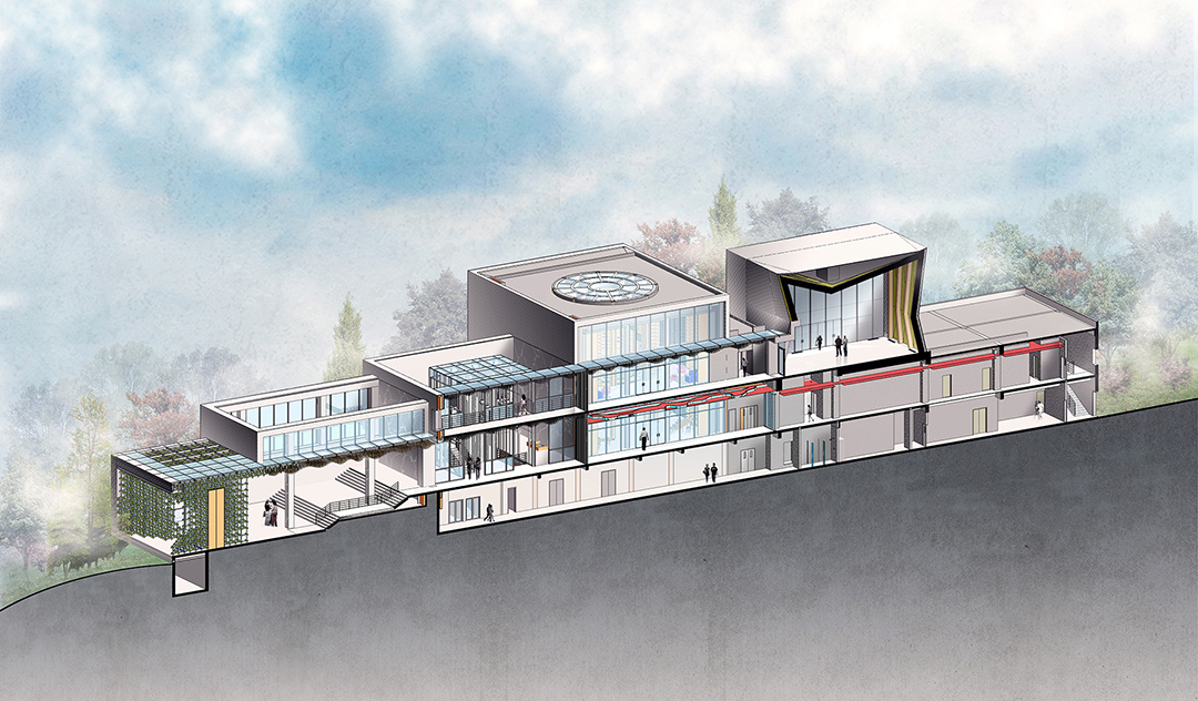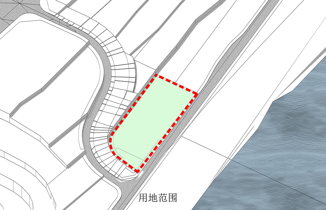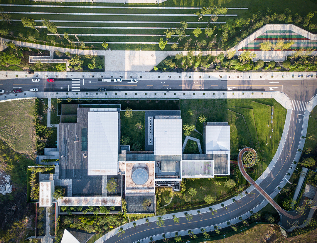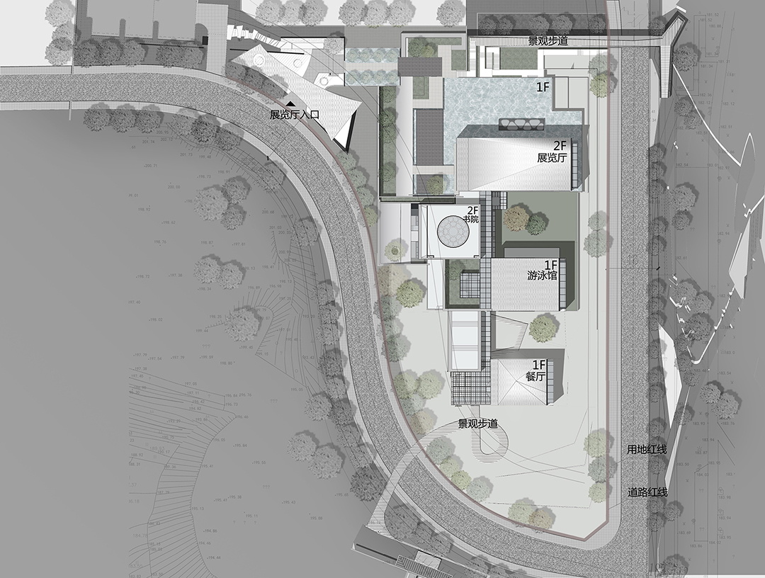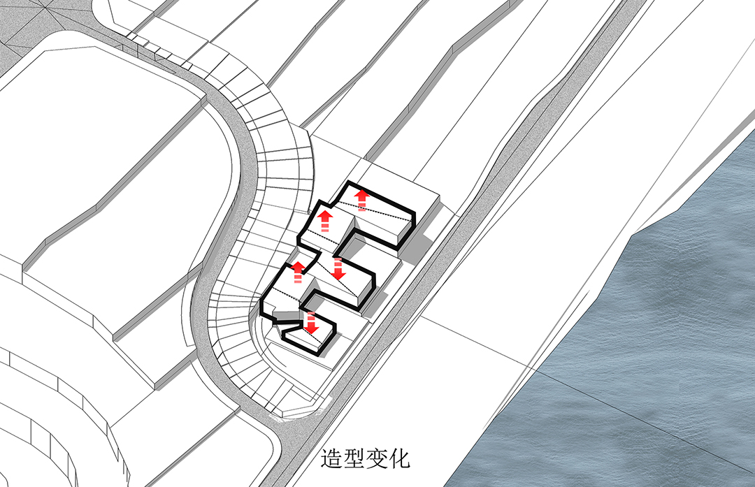 作為對環(huán)境的回應(yīng),建筑師將三個體量不同的盒子并列于山坡上,垂直于濱河道路,以期達(dá)到濱河景觀及遠(yuǎn)山的最佳觀賞。通過建筑與環(huán)境的互塑共生,使遠(yuǎn)山、河流、庭院、建筑重塑構(gòu)成新的秩序,營造獨有坡地特征的建筑群落。