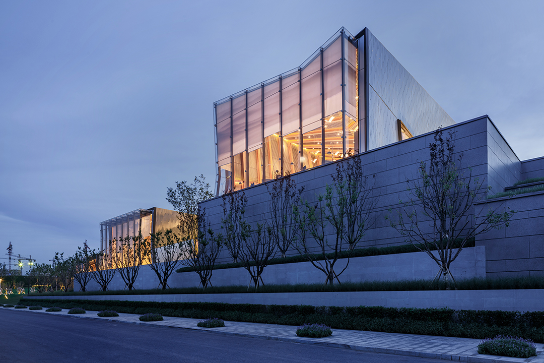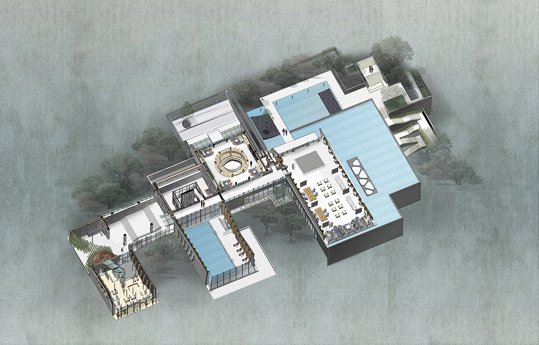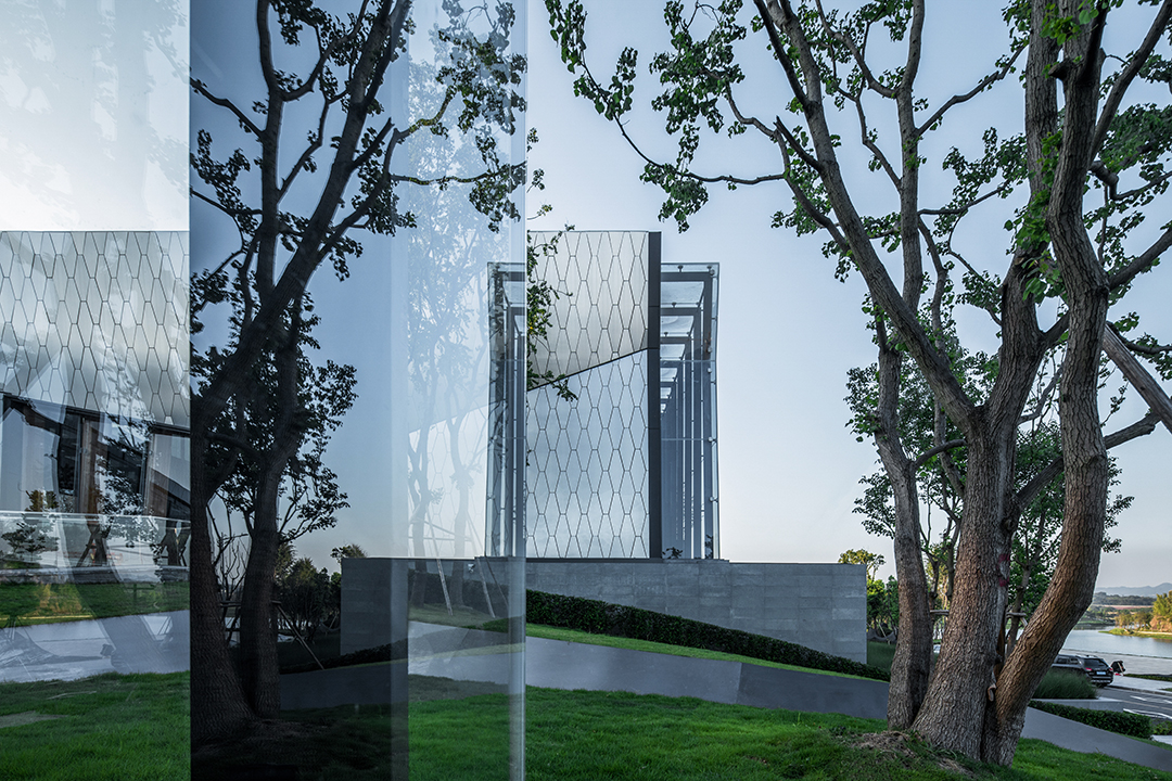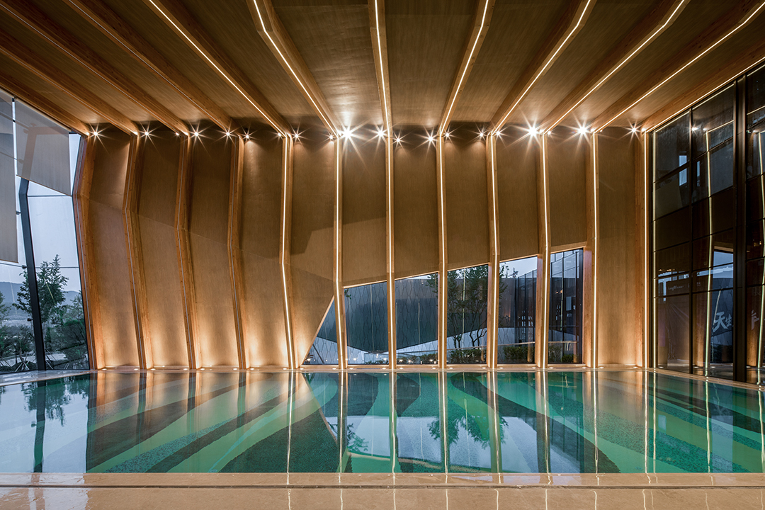 建筑師依據(jù)功能將每一個建筑空間依序形成不同的體量,展覽廳、書吧、游泳池、餐廳等順次形成多重院落空間,虛實空間的變化過渡一如中式游園,將傳統(tǒng)中式意境融入現(xiàn)代空間中。