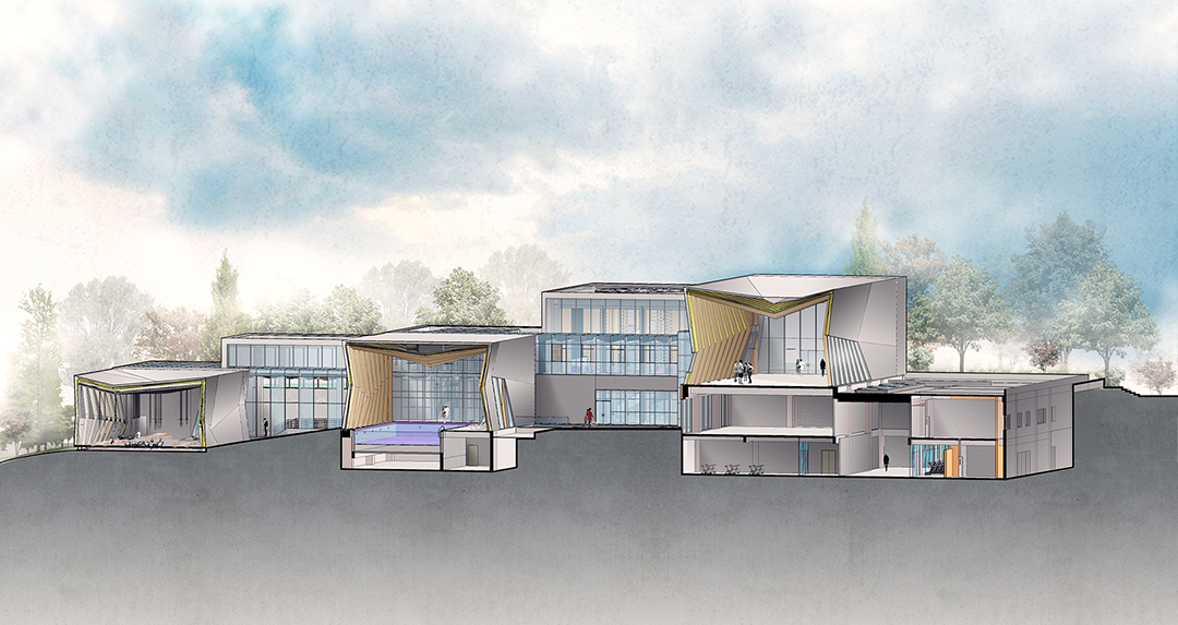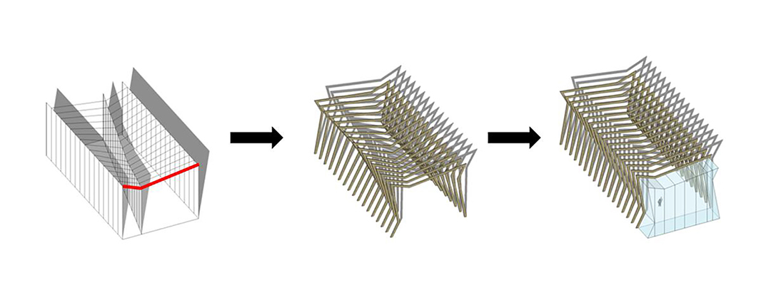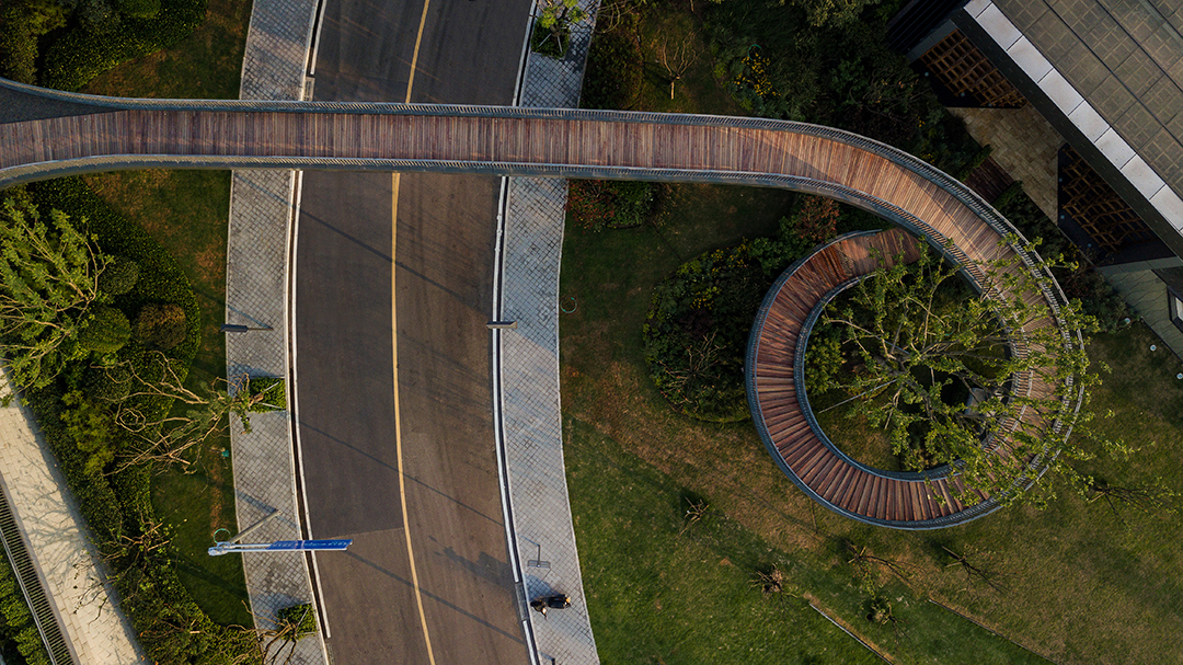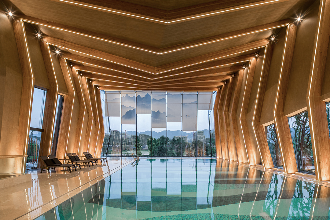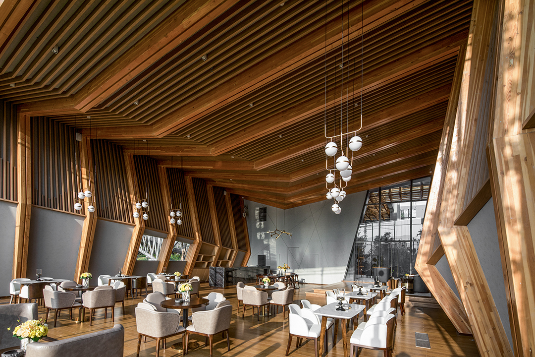 暴露的膠合木結(jié)構(gòu)構(gòu)件是建筑中最重要的視覺元素。建筑師以重慶傳統(tǒng)的折坡屋頂秩序的形式語言轉(zhuǎn)換成為建筑形體,抽取變化的單元模式轉(zhuǎn)為結(jié)構(gòu)構(gòu)件,多片構(gòu)件以秩序和變化排列組合,產(chǎn)生緊密的空間與形體的變化。