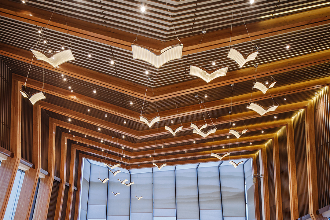 木構(gòu)件筆直搭接,嚴(yán)整清晰,建構(gòu)感強。流暢的線條和統(tǒng)一的韻律感使建筑空間極具張力。構(gòu)件體現(xiàn)出的動態(tài)平衡,豐富了建筑語言,將空間變得非常具有戲劇化。