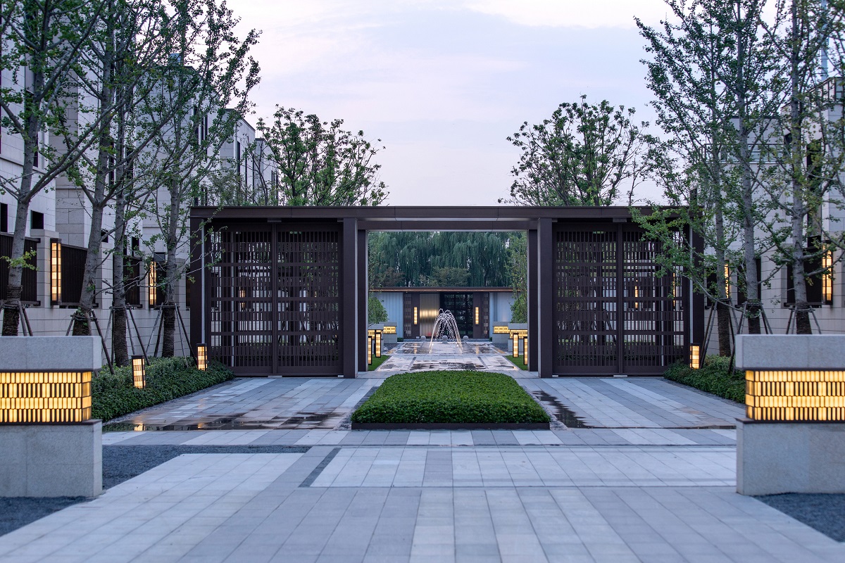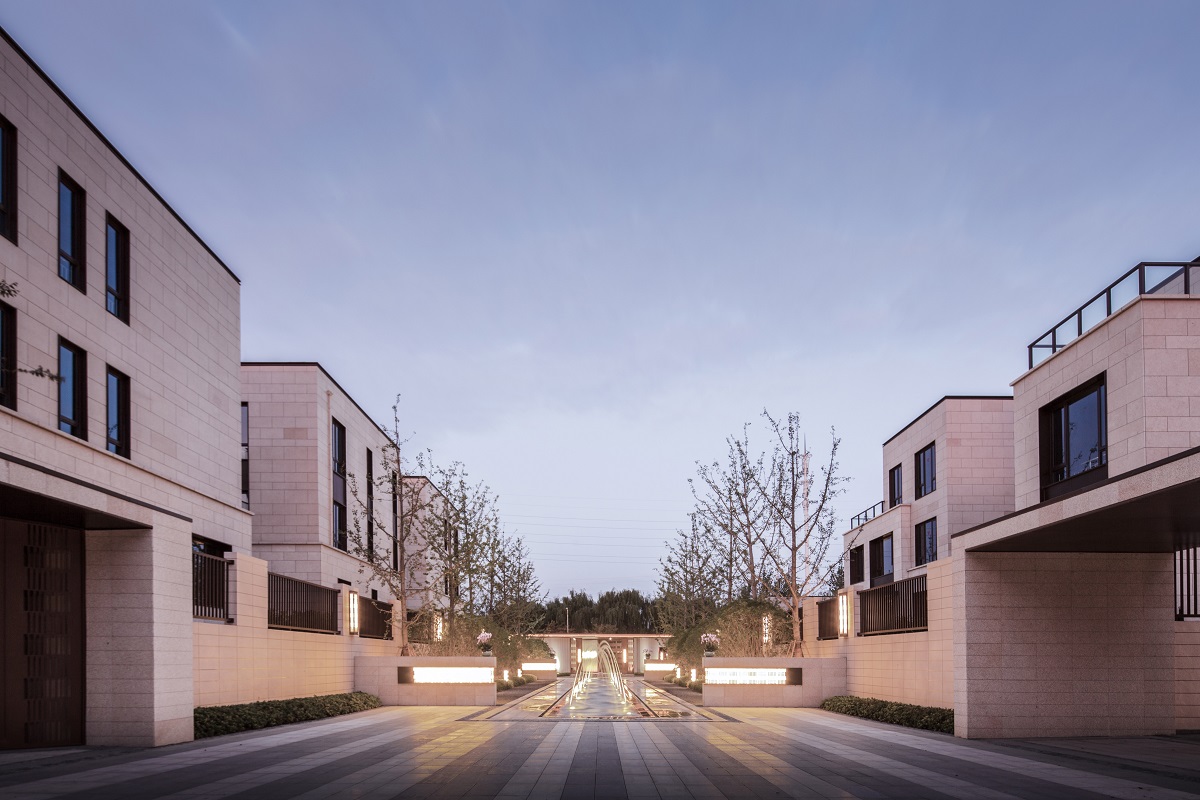 穿過景觀主軸線,在序列的景墻引導(dǎo)下,進入一個低奢優(yōu)雅的環(huán)境中。軸線干凈流暢,貫串始終,精致純粹的線性水景配以“之”字型噴泉,使得該區(qū)充盈著生機與活力。巷道入口以柔和的米黃色作為基調(diào)的景觀門頭,深咖色氟碳漆鋼板格柵裝飾其門扇,尊貴精致且通透。