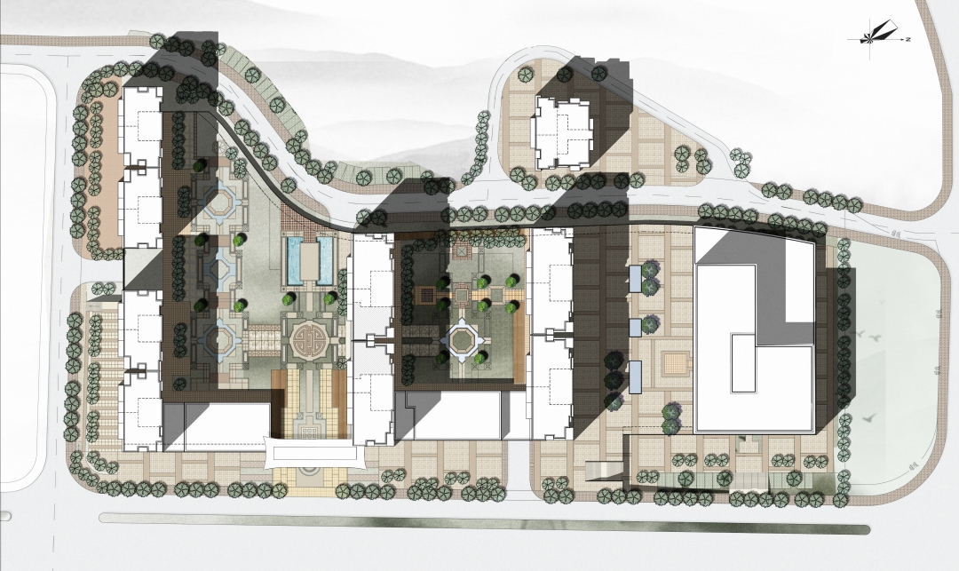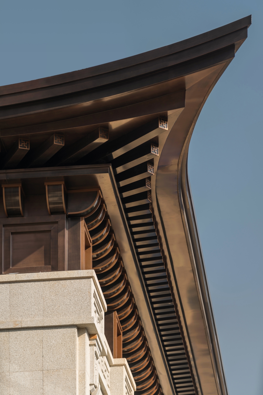 不僅在大門、二進(jìn)院等位置強(qiáng)調(diào)唐代建筑出檐深遠(yuǎn)的特點(diǎn),更是在高層住宅上創(chuàng)新地嘗試飛檐的設(shè)計(jì)手法,這無疑對設(shè)計(jì)及施工都是一個巨大的考驗(yàn),在不斷地深化和積累后,形成了獨(dú)特的“唐風(fēng)飛檐”的特色。