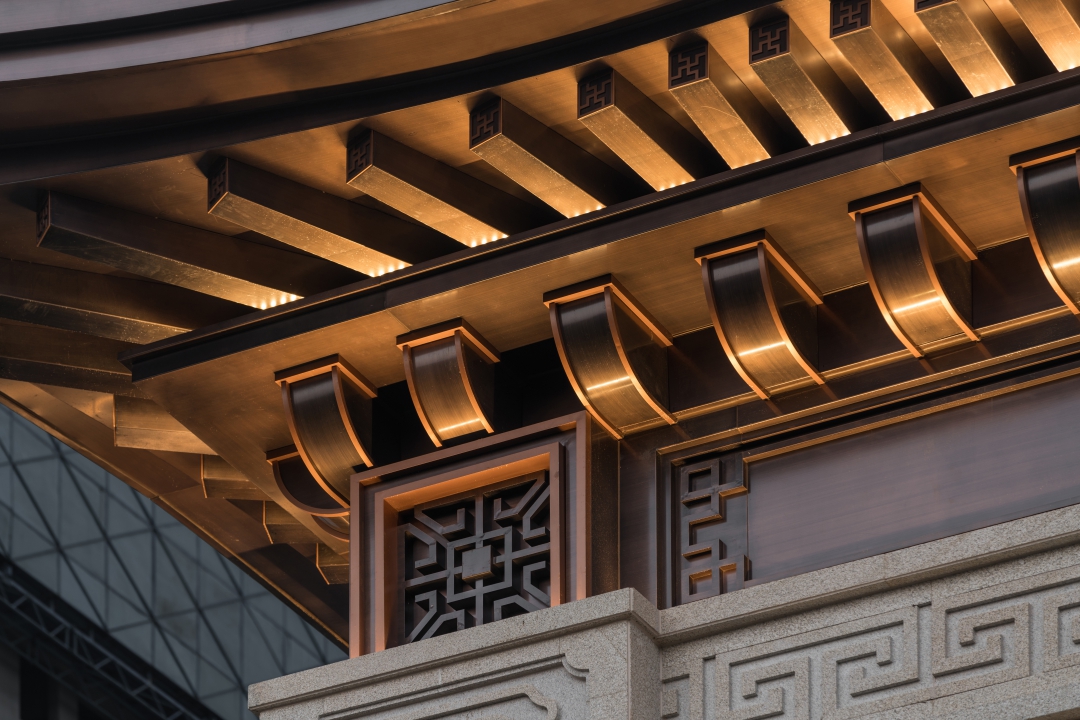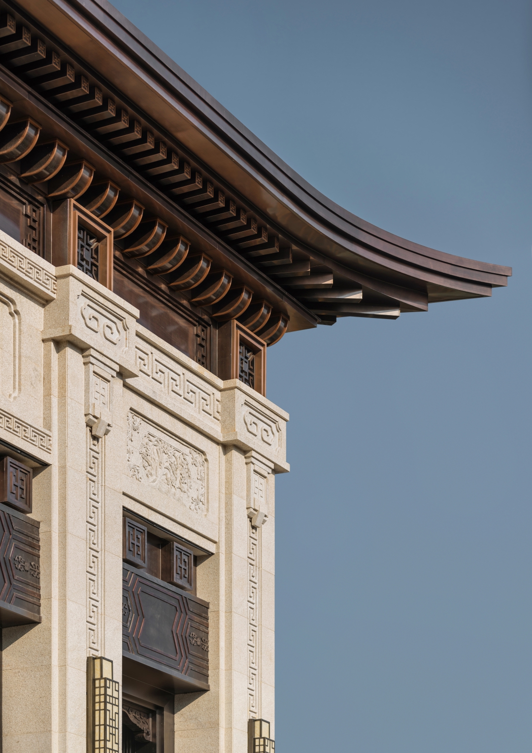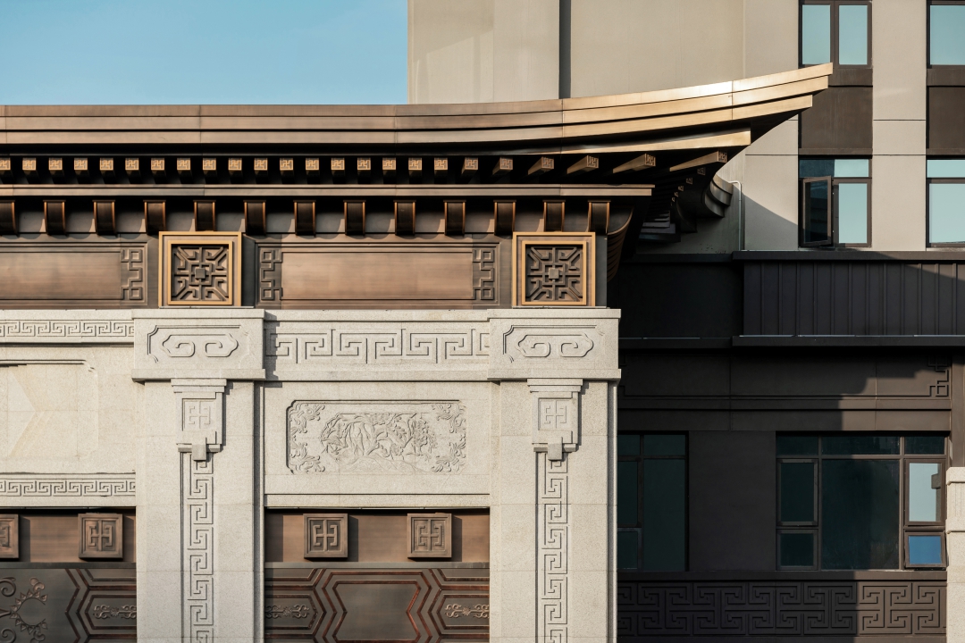 傳統(tǒng)符號進(jìn)行抽象化和幾何化處理,隱喻了中國傳統(tǒng)文化的同時表明了其現(xiàn)代化的特征,石材的構(gòu)造特性、美學(xué)特性創(chuàng)造形式上的視覺美感,借助色彩、光感、質(zhì)感、紋理、材料的相互穿插與交織,形成忽隱忽現(xiàn)的具有特殊韻律美的外觀形式。