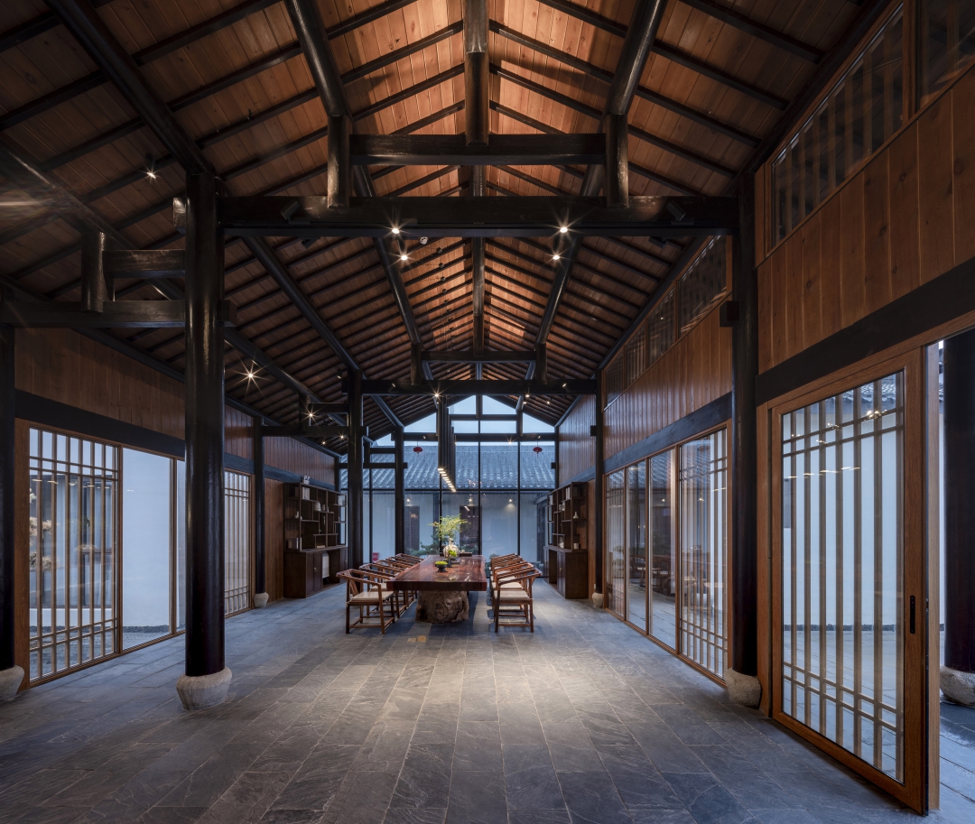 以現(xiàn)代木結(jié)構(gòu)建筑的建造手法,復(fù)原大堂傳統(tǒng)的穿斗式木結(jié)構(gòu)。天然豐富的紋理,溫暖的色澤使木材具有無可替代的表現(xiàn)力和自然的親和力。天然材料的運(yùn)用和黑白灰的用色特點(diǎn),塑造出淡雅質(zhì)樸的建筑外觀與中庸和諧的空間特征。