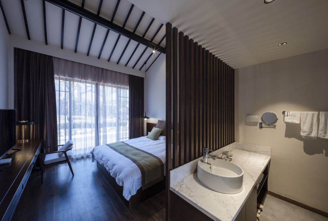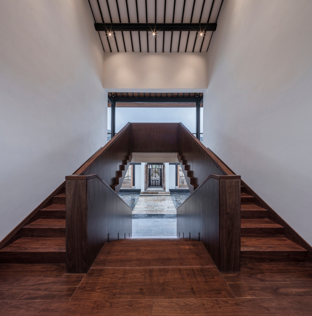 大堂由大幅落地窗與玻璃門圍合而成,以現(xiàn)代手法重構(gòu)通透的視覺效果,庭院的四季變化盡收眼底。即保持了傳統(tǒng)民居的符號(hào)又體現(xiàn)了現(xiàn)代建筑的融合性和一致性,也是地域文化、鄉(xiāng)土文化的一種回歸方式。