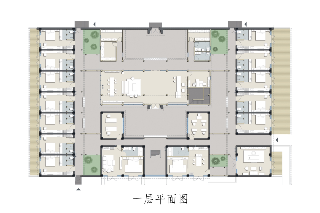 14間客房沿建筑外側(cè)布局,穿插若干景觀庭院,保證每間客房良好的景觀視線。穿過大堂,延木構(gòu)樓梯拾階而上,行至二樓客房??头恳阅旧珵榛{(diào),黑白灰為輔,溫潤質(zhì)樸,自然舒適,住客能感受“寶鼎茶閑煙尚綠,幽窗棋罷指猶涼”的詫寂之美。