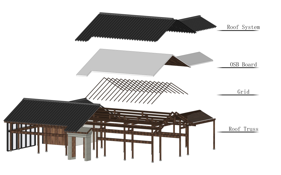 木結(jié)構(gòu)坡屋面采用掛瓦方式,在傳統(tǒng)的掛瓦節(jié)點(diǎn)的木椽條間充填防火保溫層,增加建筑保溫性能,優(yōu)于國家節(jié)點(diǎn)要求。并在檐口部分增加泛水板,更好的保護(hù)了木結(jié)構(gòu),大大增加了木構(gòu)的使用壽命。
