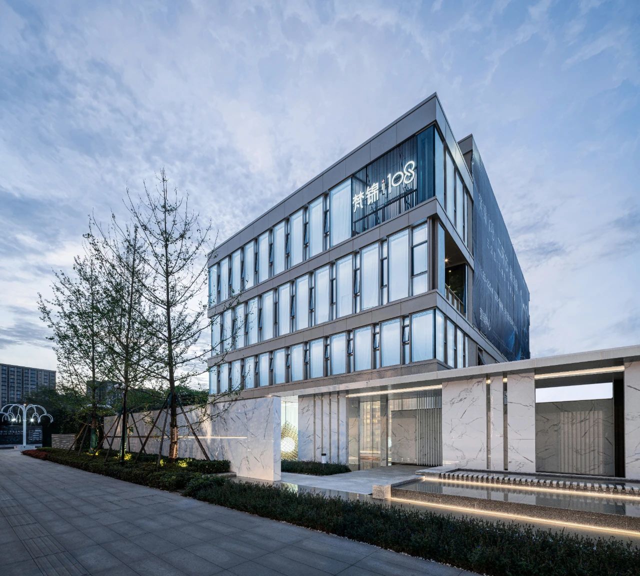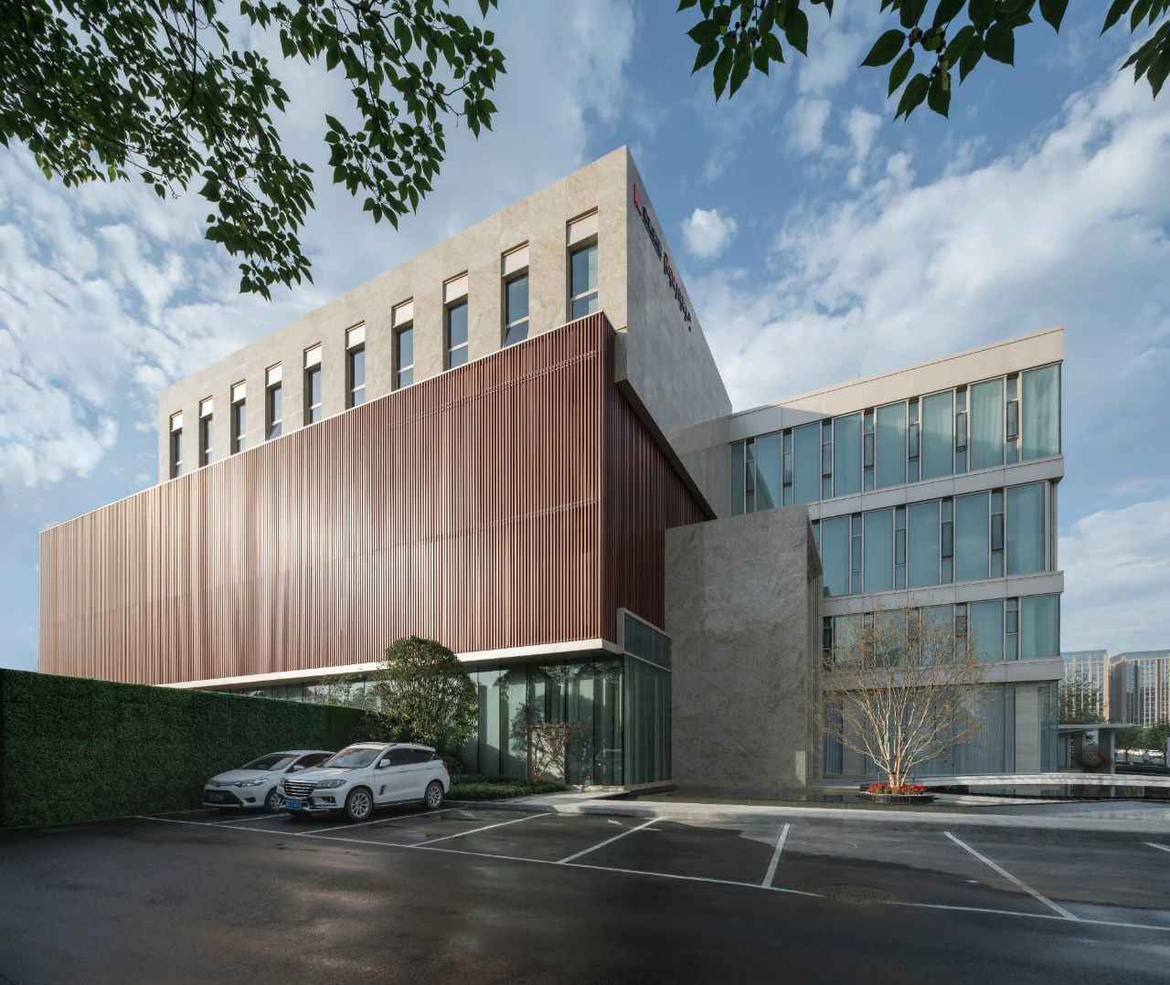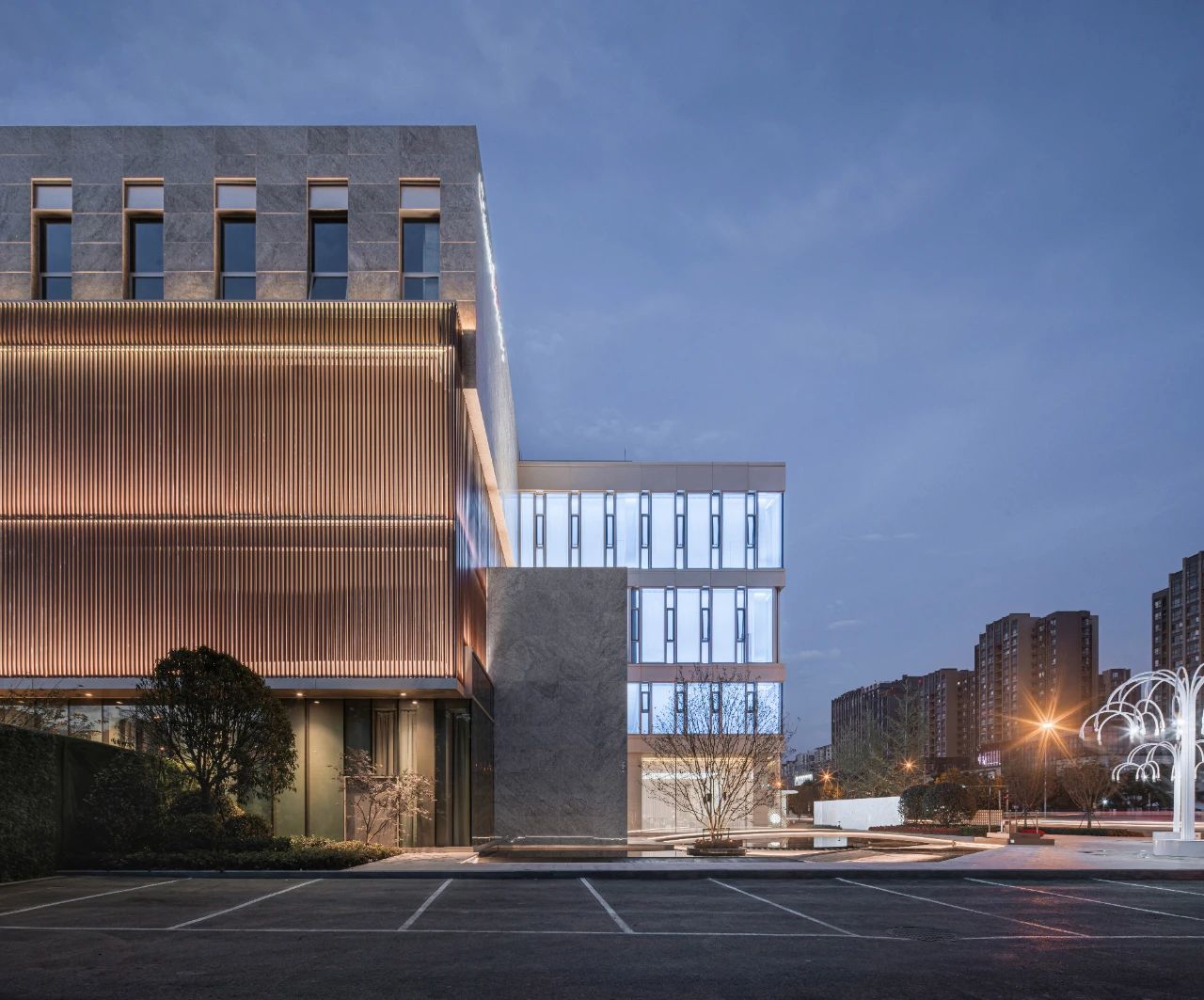立面材料分兩個(gè)主要元素,入口處運(yùn)用米黃色石材和鋁合金格柵幕墻的交織,整體色彩協(xié)調(diào)性較好,實(shí)體墻和半透明材料的交替形成表面的韻律。表皮以統(tǒng)一而富有變化的造型帶來(lái)強(qiáng)烈的視覺(jué)沖擊,營(yíng)造出一個(gè)潔凈的環(huán)境同時(shí)又是相對(duì)較為素雅輕奢的立面。