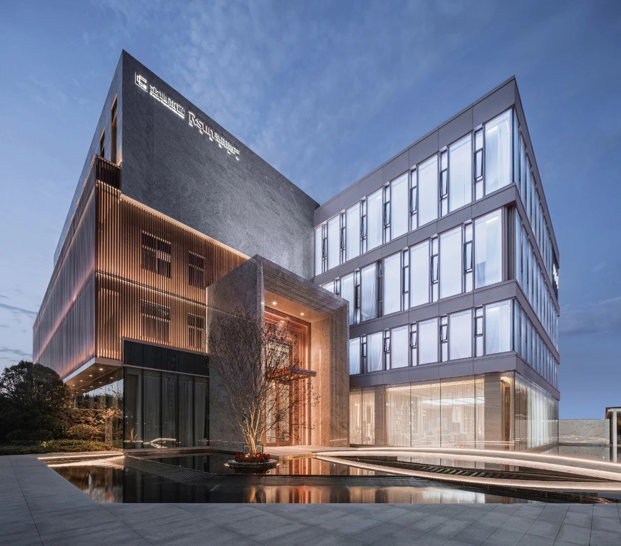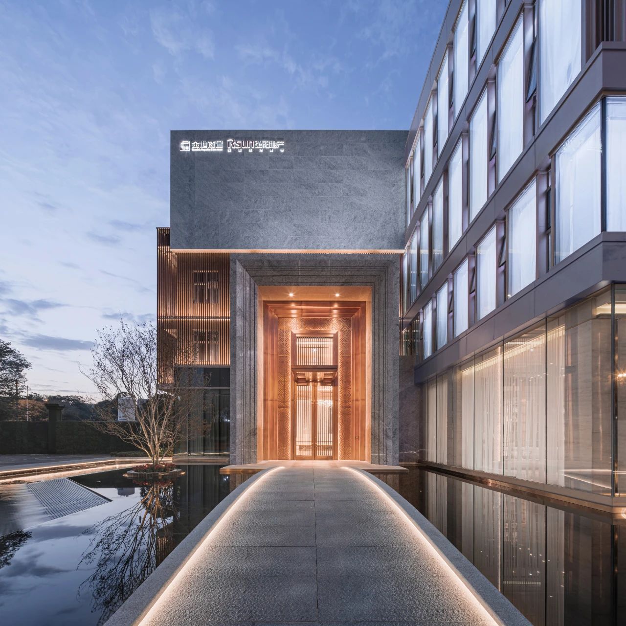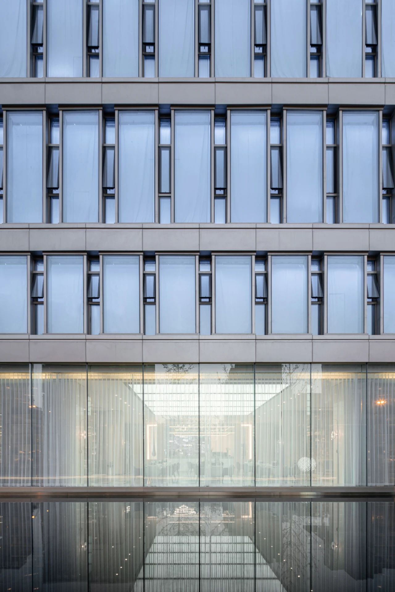 立面材料分兩個(gè)主要元素,入口處運(yùn)用米黃色石材和鋁合金格柵幕墻的交織,整體色彩協(xié)調(diào)性較好,實(shí)體墻和半透明材料的交替形成表面的韻律。表皮以統(tǒng)一而富有變化的造型帶來(lái)強(qiáng)烈的視覺(jué)沖擊,營(yíng)造出一個(gè)潔凈的環(huán)境同時(shí)又是相對(duì)較為素雅輕奢的立面。