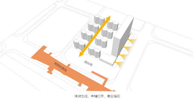 結(jié)合兒童游樂,藝術(shù)娛樂,健身體驗等三大功能,通過綠色景觀軸的延伸,打造具有高效步行空間、完善的配套公共服務(wù)設(shè)施等一系列優(yōu)勢的鄰里生活街區(qū),極大地提升區(qū)域內(nèi)的居住活力氛圍,形成居住,商業(yè),配套與游樂的無縫對接。