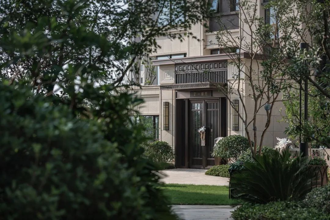 住宅單元入口以近4米的門頭高度,全石材加仿銅拉絲不銹鋼,雕琢出歸家的儀式感。提取中式祥瑞元素,利用祥云符、如意符、回字紋及錦紋,營造尊崇感。