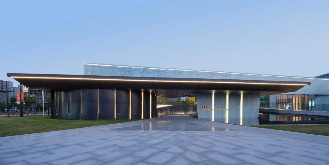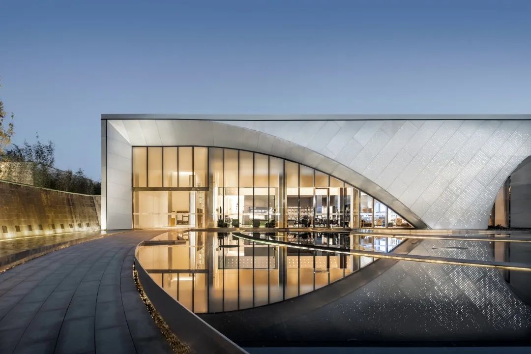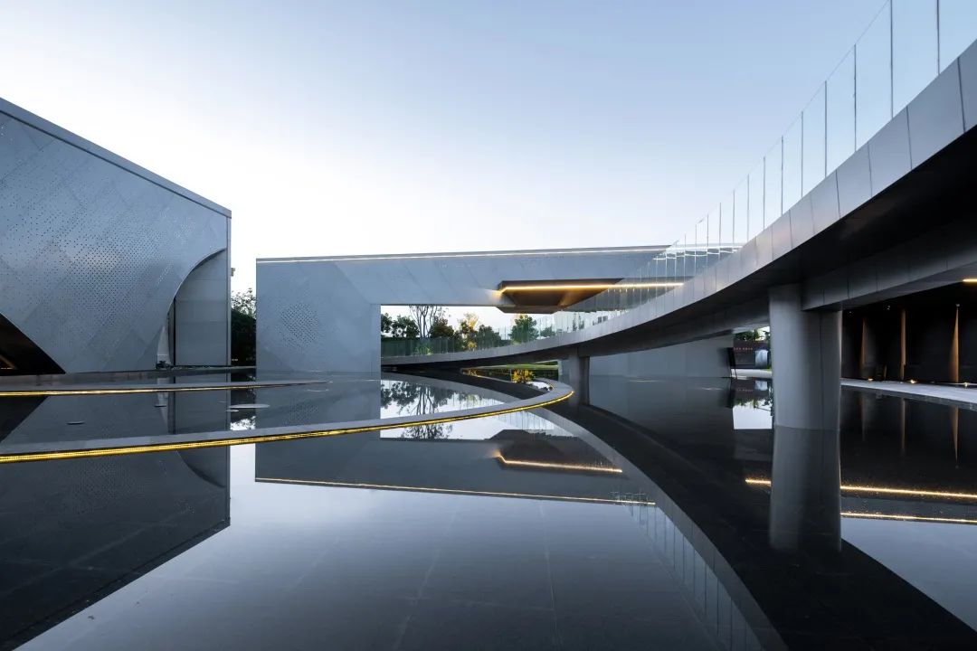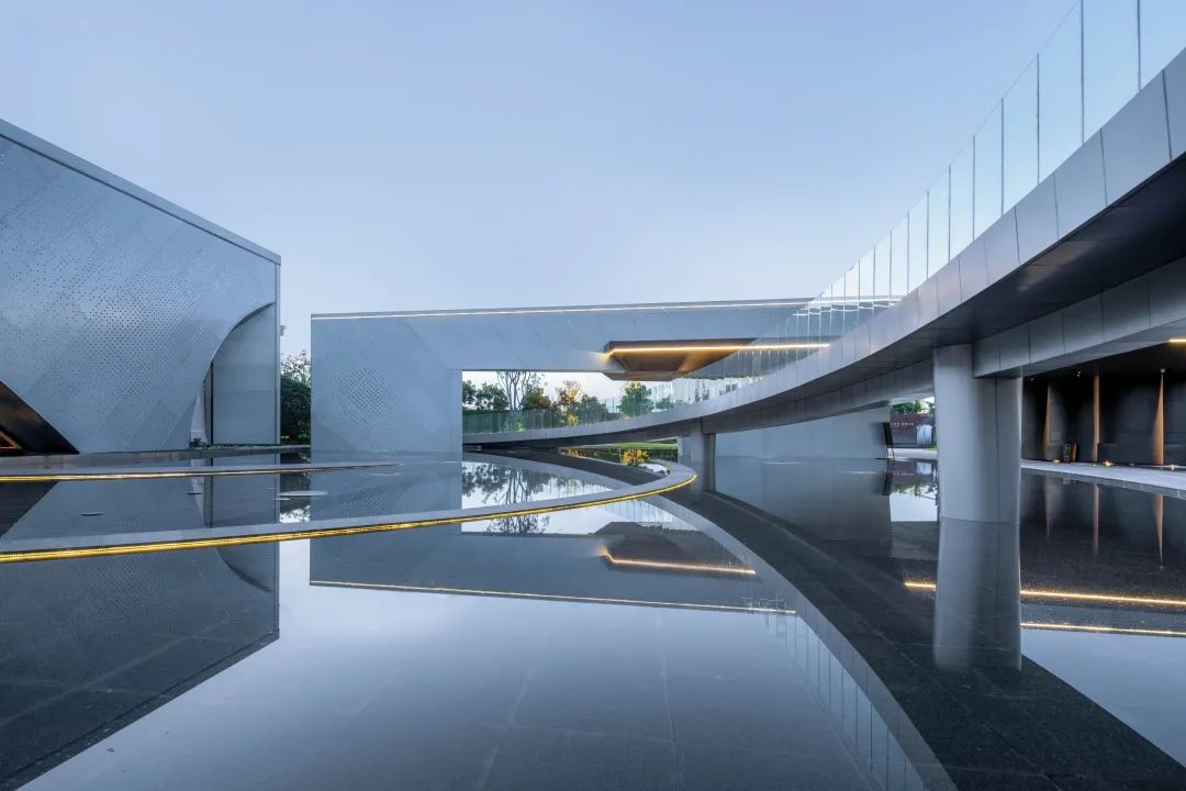 獨特的示范區(qū)入口門頭設(shè)計,三角形交錯切割搭的頂蓋搭配弧與圓變形拼接的墻體,選用與建筑表面相同的鋁板材質(zhì),讓每一個到訪的客戶都能體會到尊貴大氣的儀式感。大門整體框架為線條設(shè)計感十足的多邊幾何形,肆意張揚的角,似無限延伸的線,百變的面富有動感。“迎”、“聚”、“觀”一氣呵成。整體為黑白色調(diào),純粹簡約,同樣不缺少高級質(zhì)感。從內(nèi)延伸至外的水面,倒映著藍(lán)天白云,似天地顛倒闖入一片幻境,似夢而非夢。