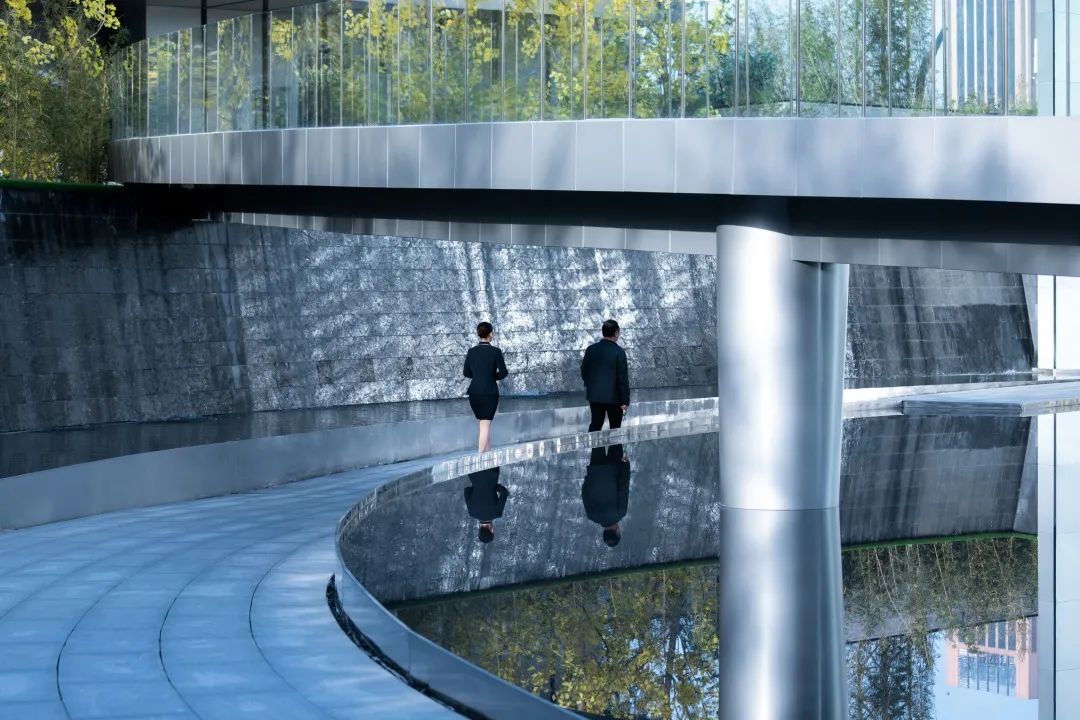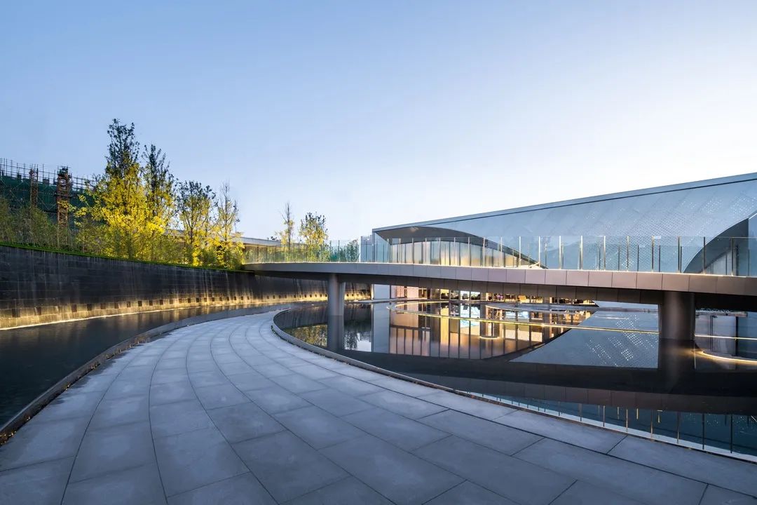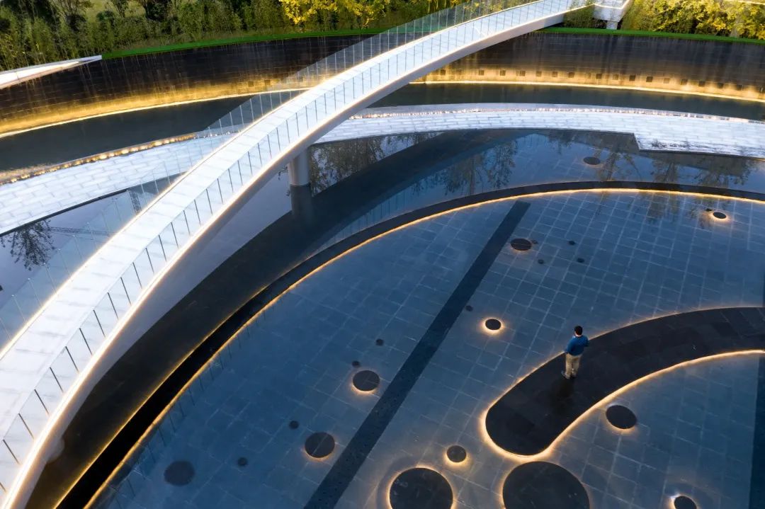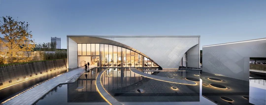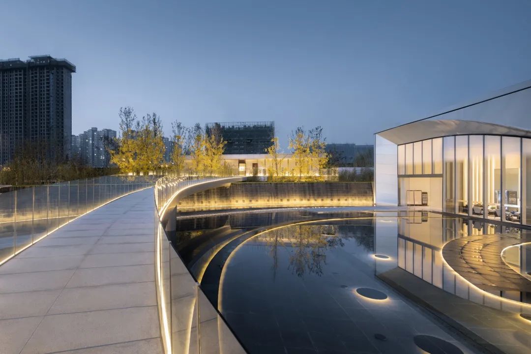 空間與視覺的連續(xù)性:立面的墻體通過藝術(shù)創(chuàng)作產(chǎn)生視覺上的肌理感,將光與影帶入到空間中,微風(fēng)拂過水波倒影連廊起伏,層層漣漪之上倒映出朦朧的樹影與建筑。運用玻璃等半透明材料,舒朗別致的造型結(jié)構(gòu)打破景觀與建筑的界限,打造空間與視覺的連續(xù)性與純凈性。