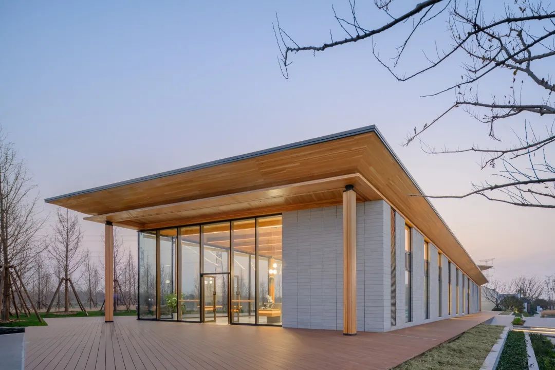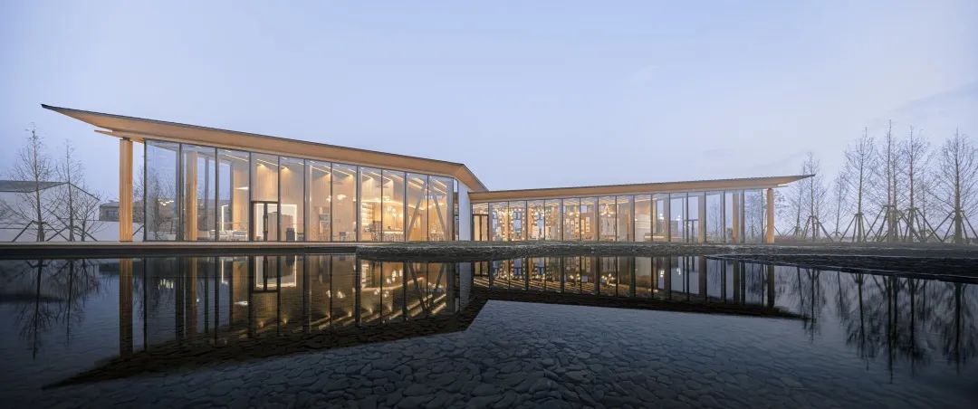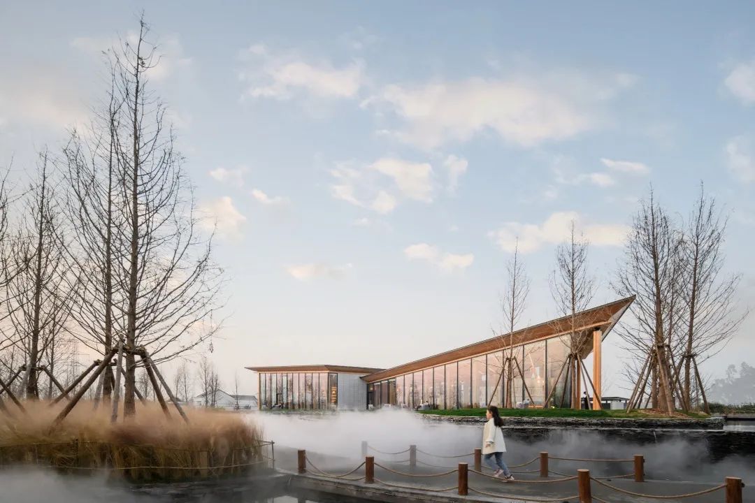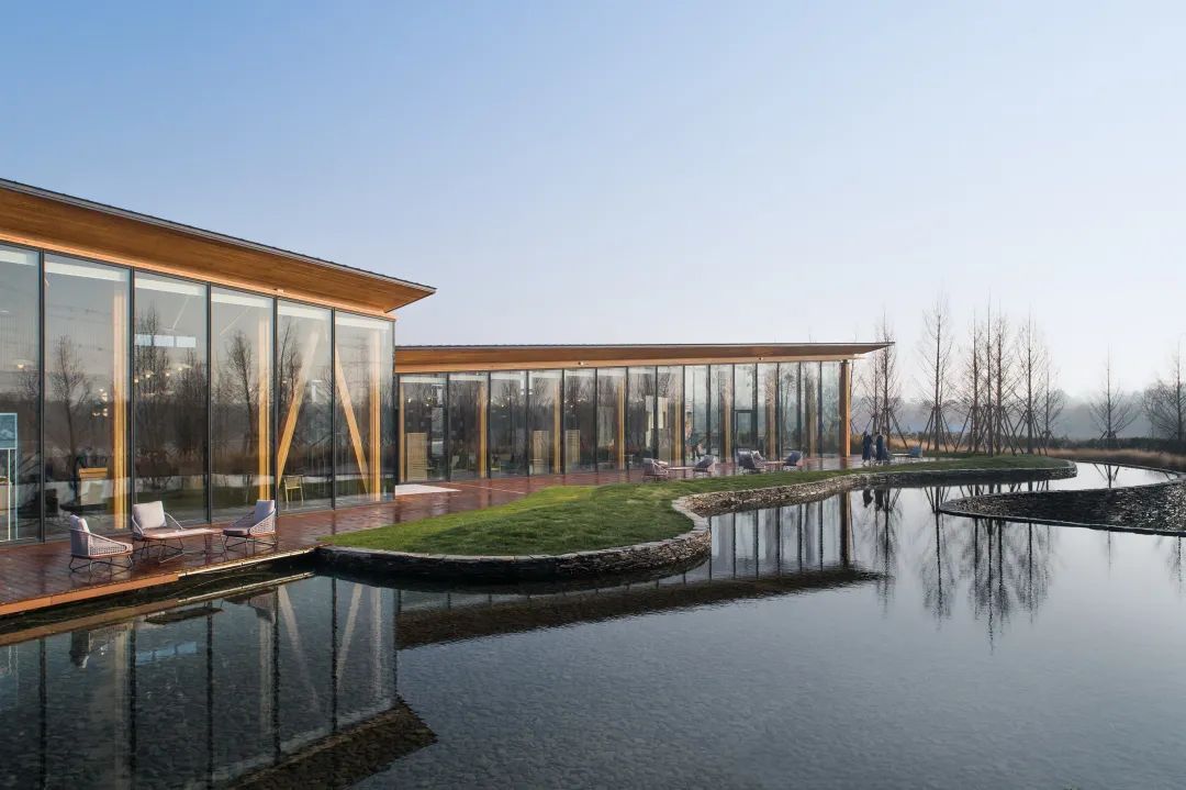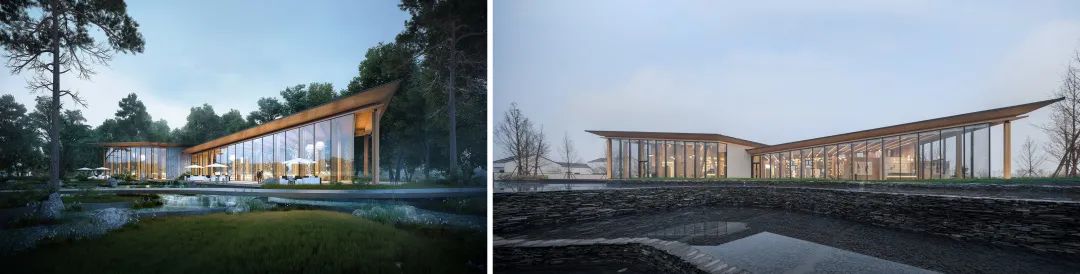 玻璃幕墻與木結(jié)構(gòu)坡屋頂是建筑的主要元素,它用輕巧的結(jié)構(gòu)定義了建筑的室內(nèi)特征,又在外部營(yíng)造了極具識(shí)別性的形象。