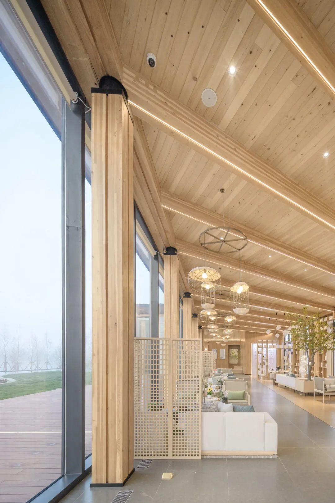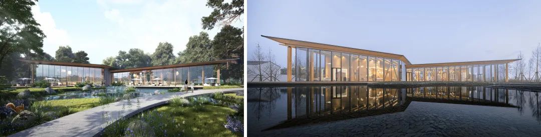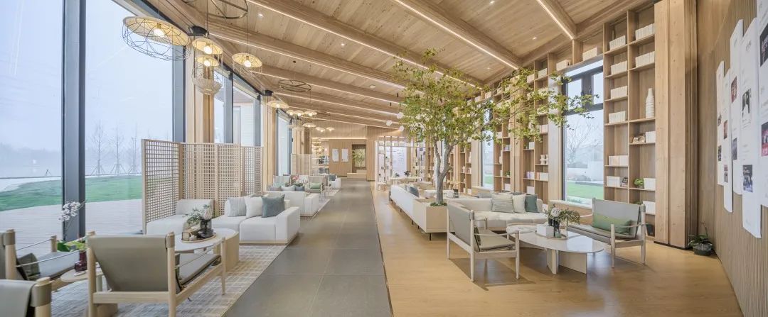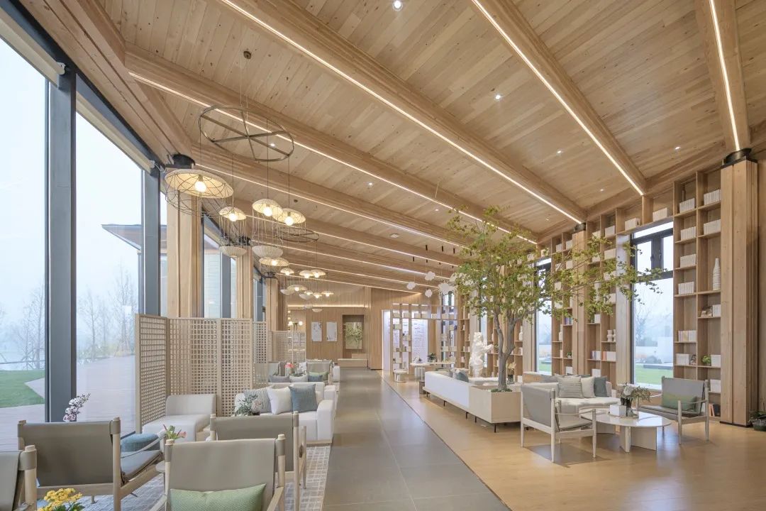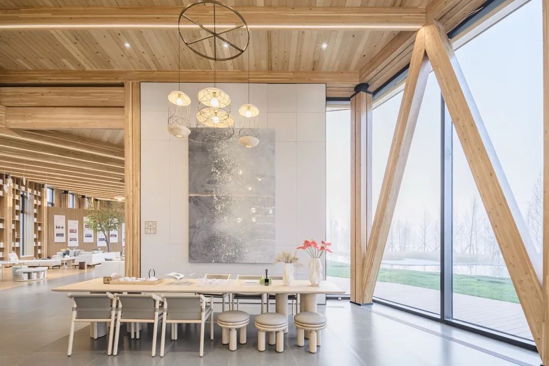 項(xiàng)目著重體現(xiàn)自然、田園、舒適的空間氛圍,重點(diǎn)詮釋木結(jié)構(gòu)空間完整性和體現(xiàn)木結(jié)構(gòu)梁柱的序列感,通過(guò)開(kāi)敞的空間布局方式,營(yíng)造出空間與建筑之間統(tǒng)一性,體現(xiàn)木結(jié)構(gòu)空間張力與自然美學(xué)氛圍。