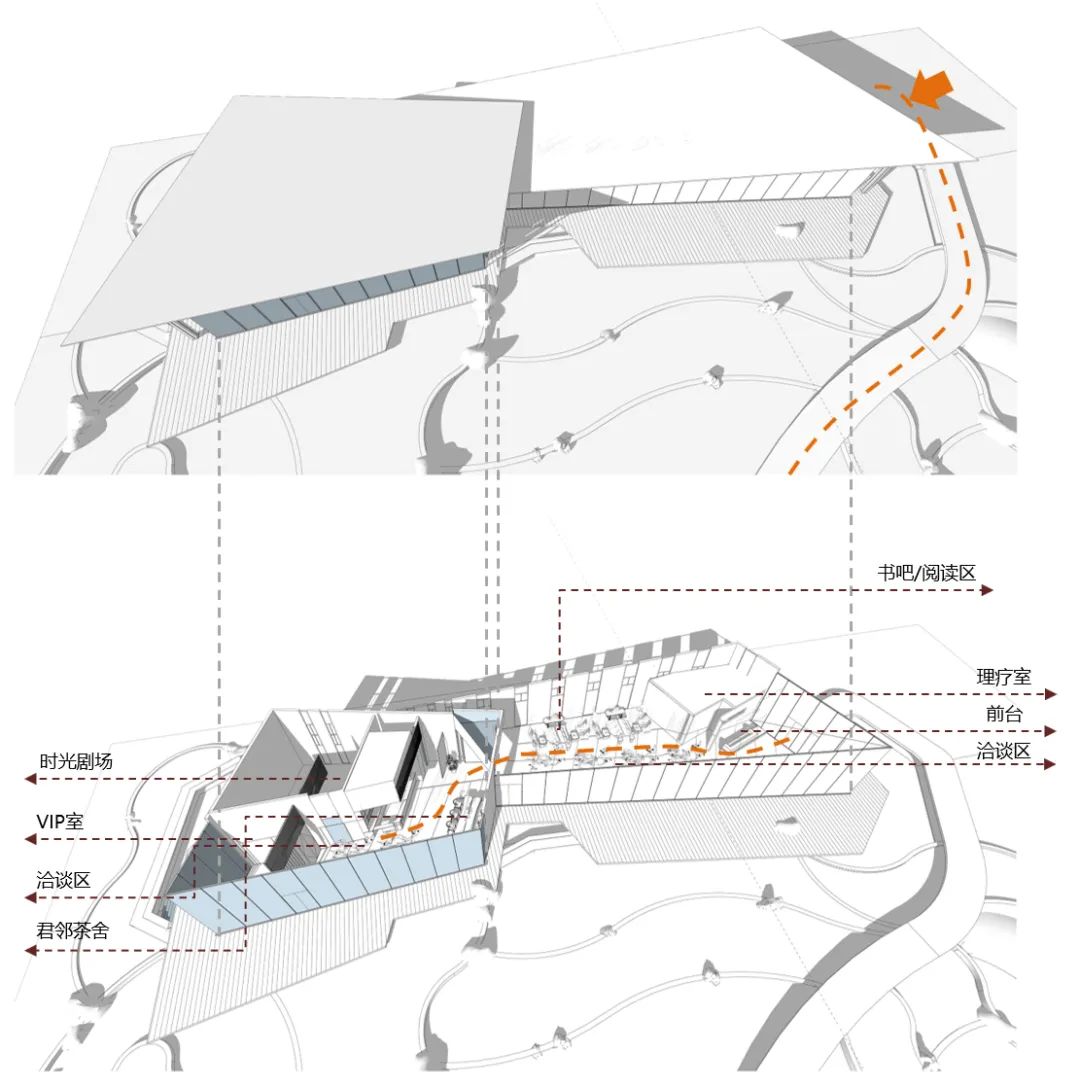 在功能分區(qū)上,最大化地利用場(chǎng)地及室內(nèi)外的優(yōu)劣勢(shì)條件,合理地進(jìn)行布置。在重要的展示面上,展示最美的展廳。