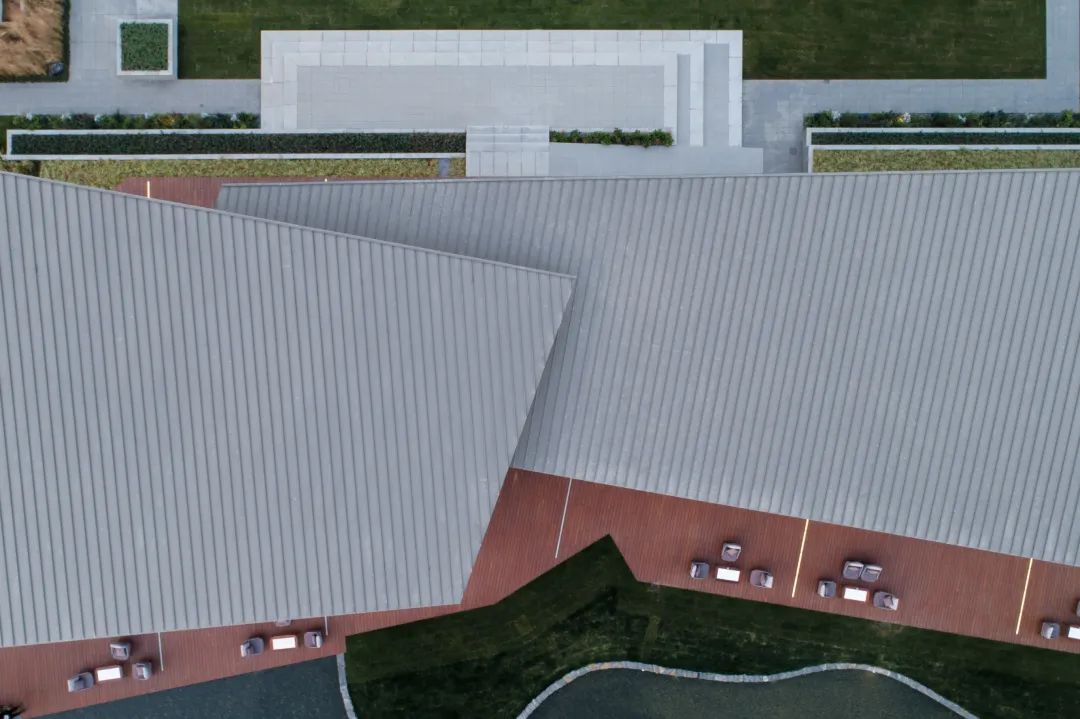 方案早期的屋面排水方案因屋頂造型的斜向坡度,排水集中在中間??紤]到暴雨天氣下,中央排水將會(huì)影響到出入口的人員出行。技術(shù)團(tuán)隊(duì)經(jīng)過(guò)多輪調(diào)整,在完全不影響立面效果的前提下,調(diào)整鎂鋁錳板直立鎖邊方向及南北朝向標(biāo)高,將排水改為南面分散式排水,保證了極端天氣情況下建筑的人員出行。