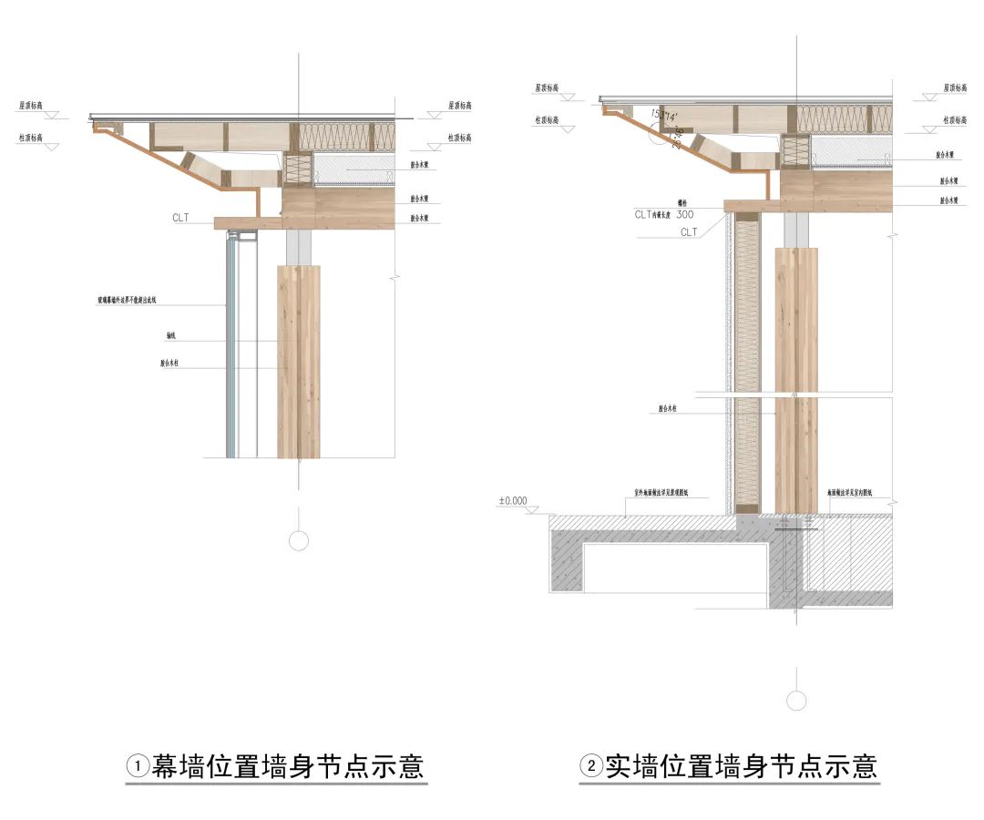 在兼顧立面效果和結(jié)構(gòu)強(qiáng)度的同時(shí),屋頂與幕墻、實(shí)墻的連接處,技術(shù)團(tuán)隊(duì)創(chuàng)新性地采用頂部檐口做薄覆以斜面CLT的方式。既解決了檐口裝飾,又解決了幕墻收口,并于結(jié)構(gòu)形成的凹槽處設(shè)置燈帶,美化了建筑夜景表現(xiàn)。