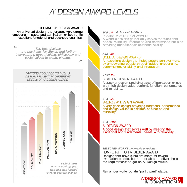 In a world where there are millions of products and designs launch each year, the award was born out of the desire to underline the best designs and well designed products. The award-winning products and designs are highlighted to the international public via the?A' Design Award Gala-Night and Exhibition?in Italy and they are communicated to all relevant press across the world. The award is organized by OMC Design Studios SRL, member of ADI and ICSID.