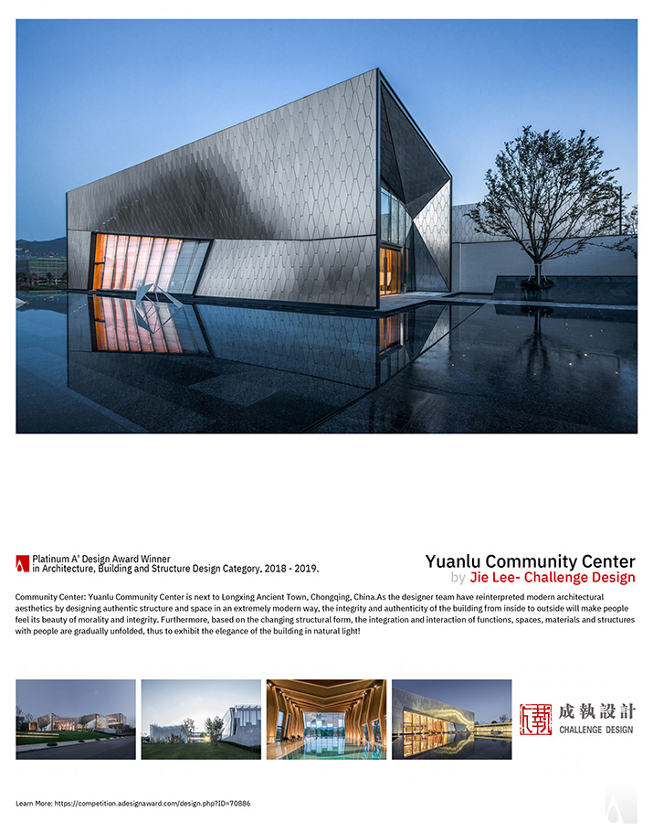 A’ Design Award & Competition (designaward.com), the World’s largest and most diffused international design awards announced results of the 2017 - 2018 design competition: 1964 Winners from 99 countries in 98 different design disciplines. Entries were carefully evaluated by an internationally influential jury panel composed of established scholars, prominent press members, creative design professionals and experienced entrepreneurs who devoted great care and attention to details while voting each entry. ?Challenge Design & JAZ BUILD as the designer and builder of the project?“Yuanlu Community Center in?Chongqing?” won?Platinum A' Design Award Winner in Architecture,?while the Platinum Award winner only accounted for 1% of the total award. The Gala Night - La Notte Premio A' (Award Ceremony of 2018 - 2019 Period) will take place at Teatro Sociale Como, on 28th of June (Friday), Teatro Sociale Como is located at Piazza Verdi, Como / Italy.?
