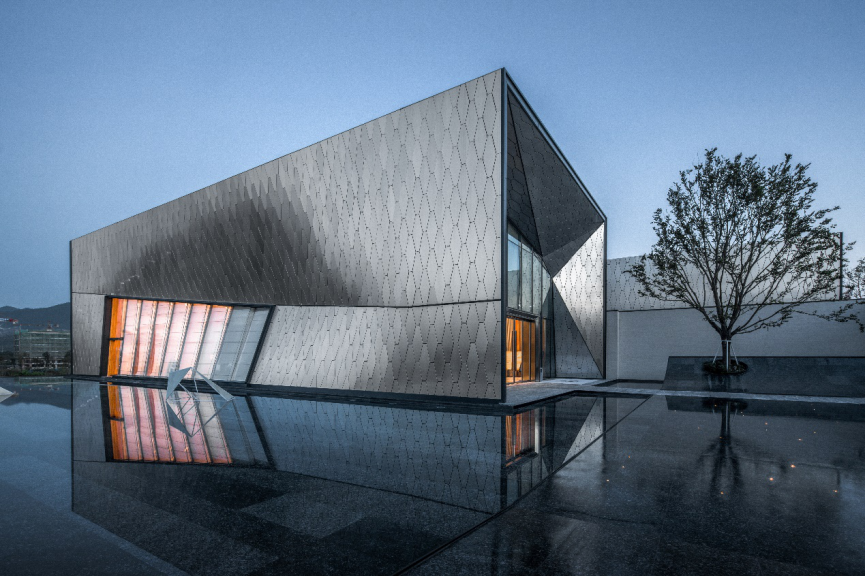 Space is inseparable from materials and structure, and is composed of building components. In this project we used glulam to create large spaces that extend over 10 meters high and 16 meters wide. Within the orderliness and rhythm there is also spatial tension. The exterior of the architecture, adapting to its structural form, unites the warping surfaces into a whole. When designing aluminum plates for the skin, we made sure the angles of each plate were well adjusted, so as to allow even the minutest changes of light to be captured by the “plates” and thus reflecting the changes of nature. In that manner the structure of the architecture, its surface and its surroundings manage to achieve an authentic, harmonious co-existence.