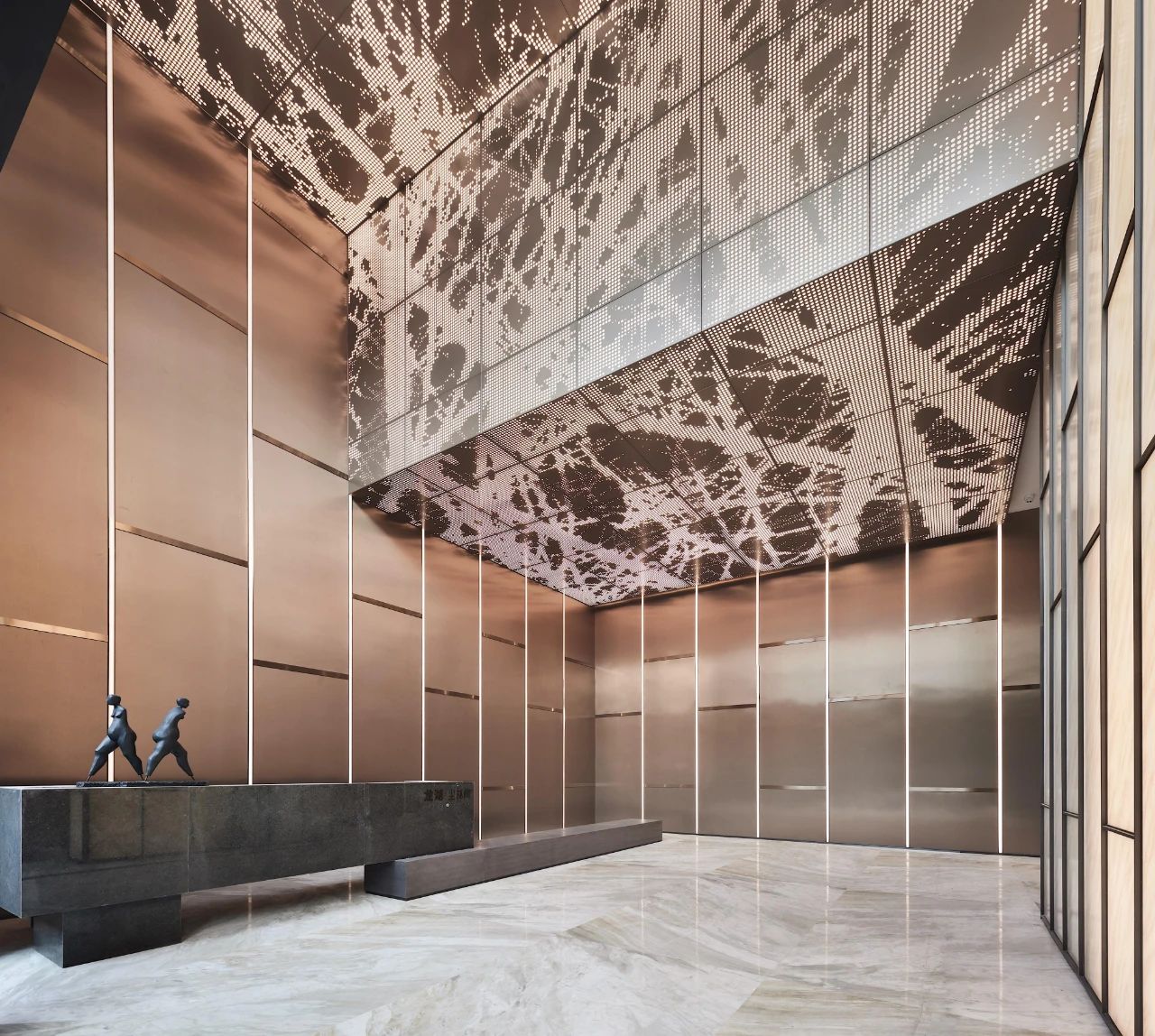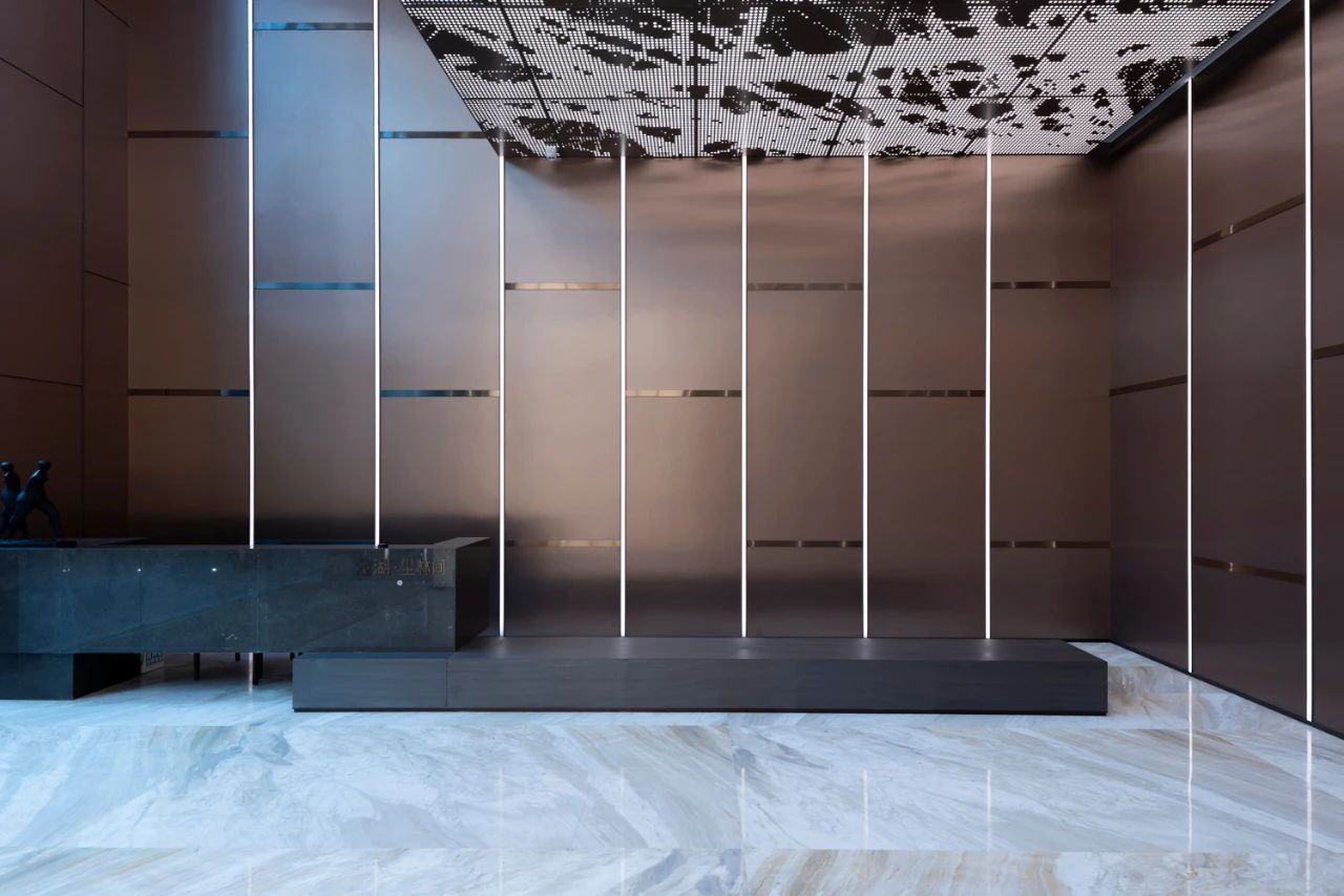 入園大堂是塵林間的第二層入口。精致的玫瑰金鋁板上是樹的投影,青銅與巖石的和諧結合,宣告了這個空間的藝術性。