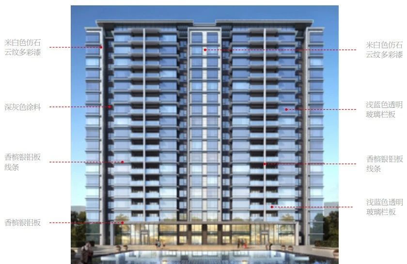 住宅立面多結合采用涂料、多彩漆、鋁板、玻璃等建筑材料;色彩運用方面穩(wěn)重、大方,基部和頂部均用鋁板材料,頂部造型簡潔方正,提升了建筑的精氣神。