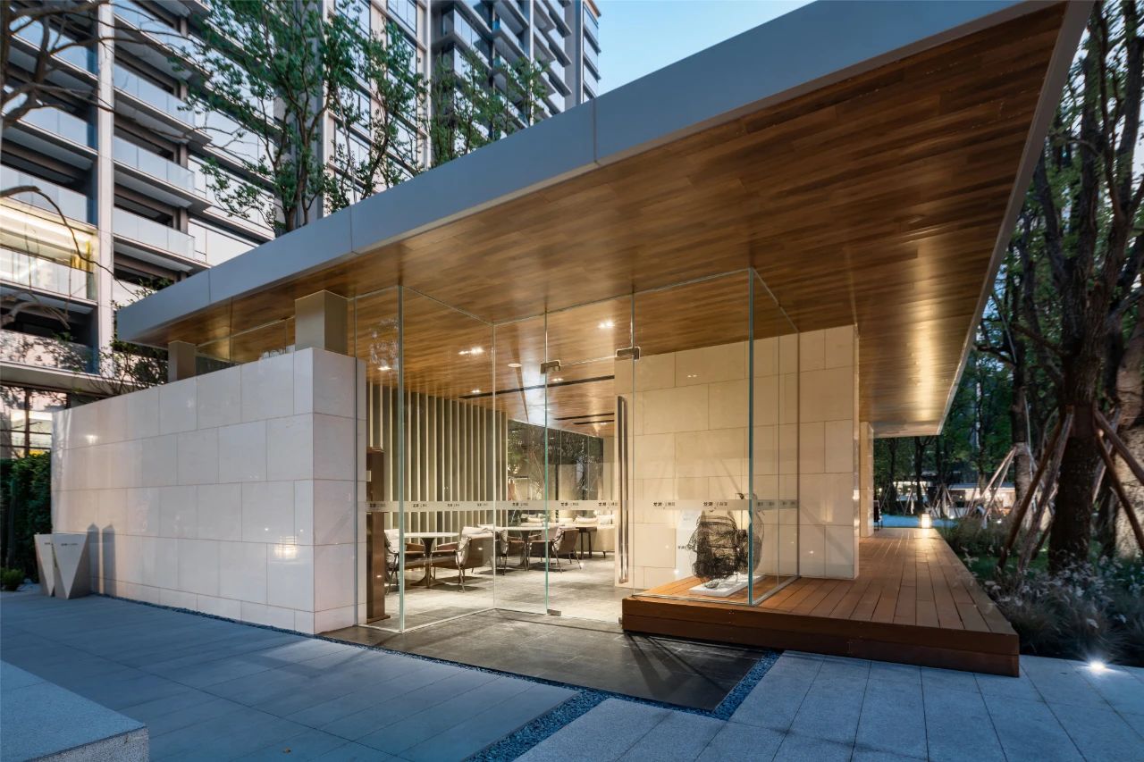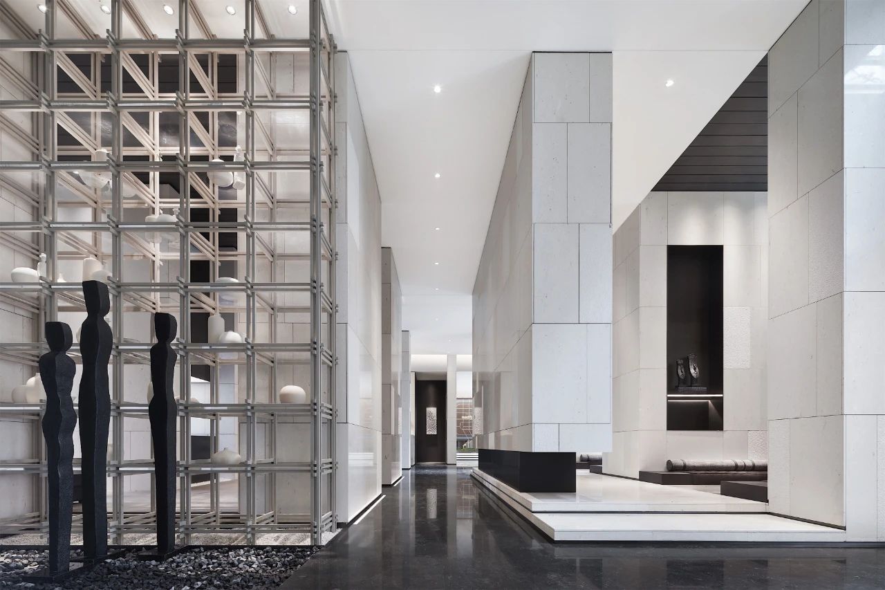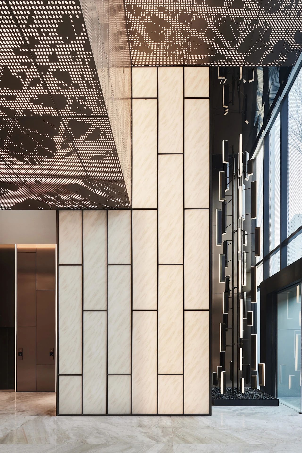 由于塵林間地塊與鄰近路面存在高差關系,大堂采用了雙層設計。大堂頂部穿孔鋁板以及配合樹形投影設計,盡藏生活哲學,體驗不可度量的生活儀式感。