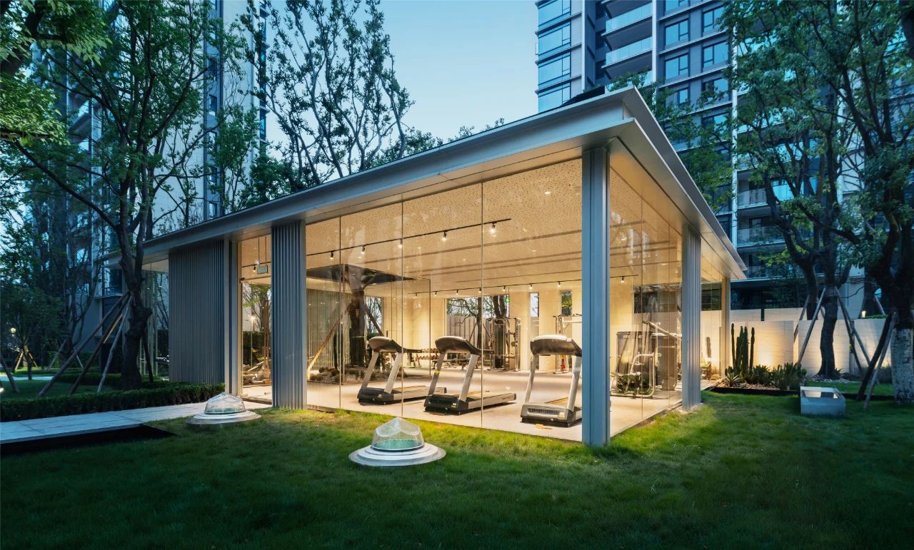 開放水景等簡約現(xiàn)代設計,外圍擋墻采用 2+1+1 隔離布局,自稱高墻秘境,城囂隔絕門外,身心回歸森林秘境。
